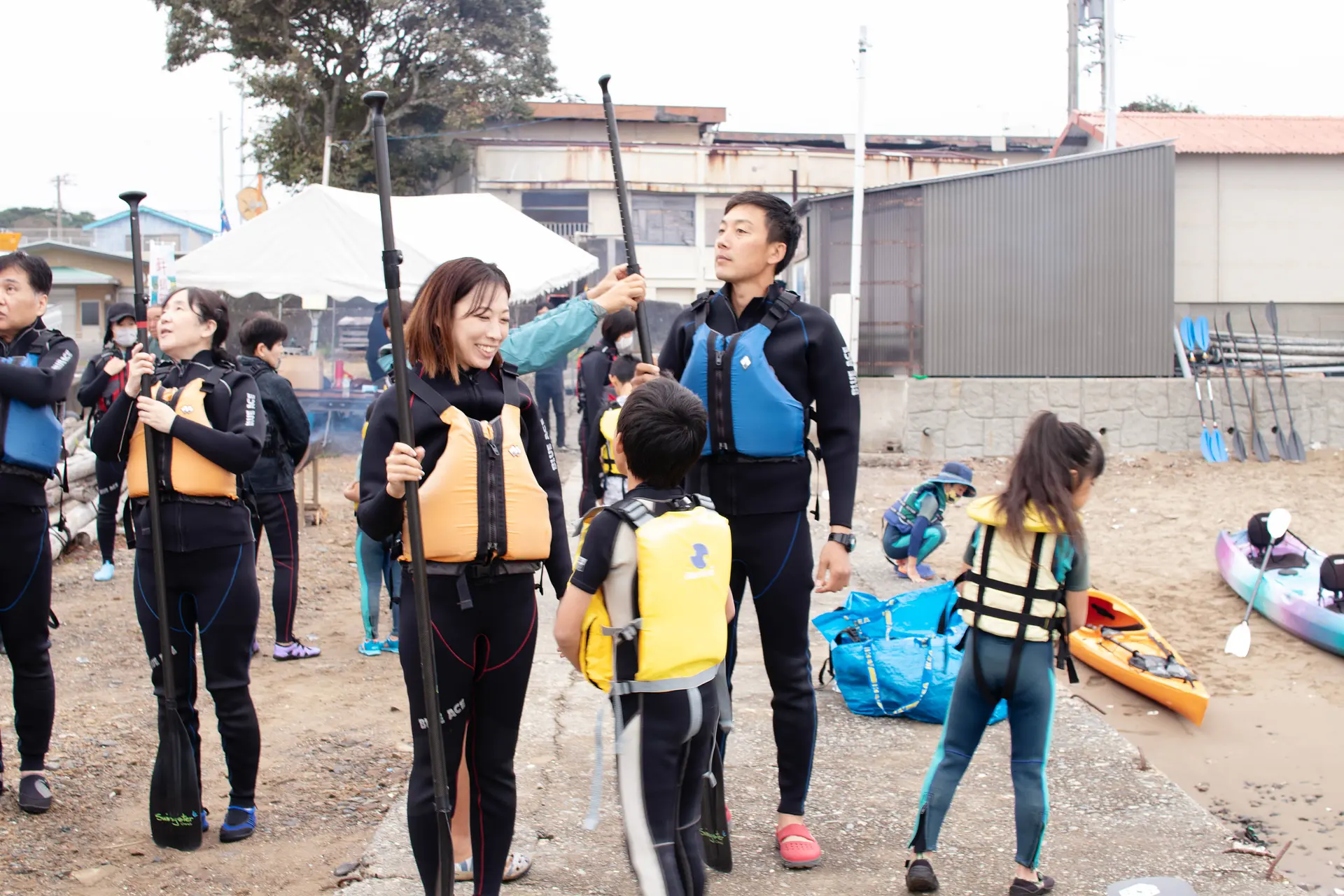 まずはライフジャケットを着用し、パドルの調整をします。