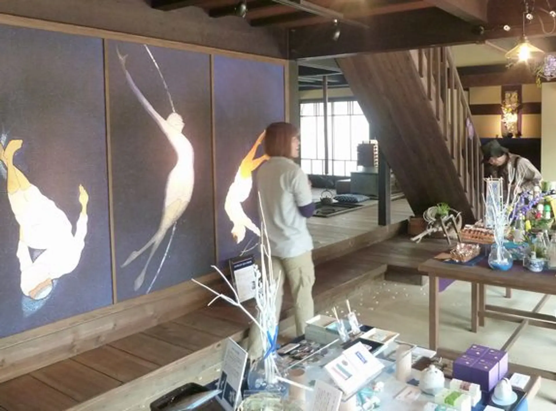 テーブルには、しおり、あぶらとり紙、匂い袋、お香やお香皿、石いかり、ドーマン・セーマンのペンダント、クッキー、鳥羽特産・牡蠣醤油や牡蠣ぽん酢などが並べられていました。