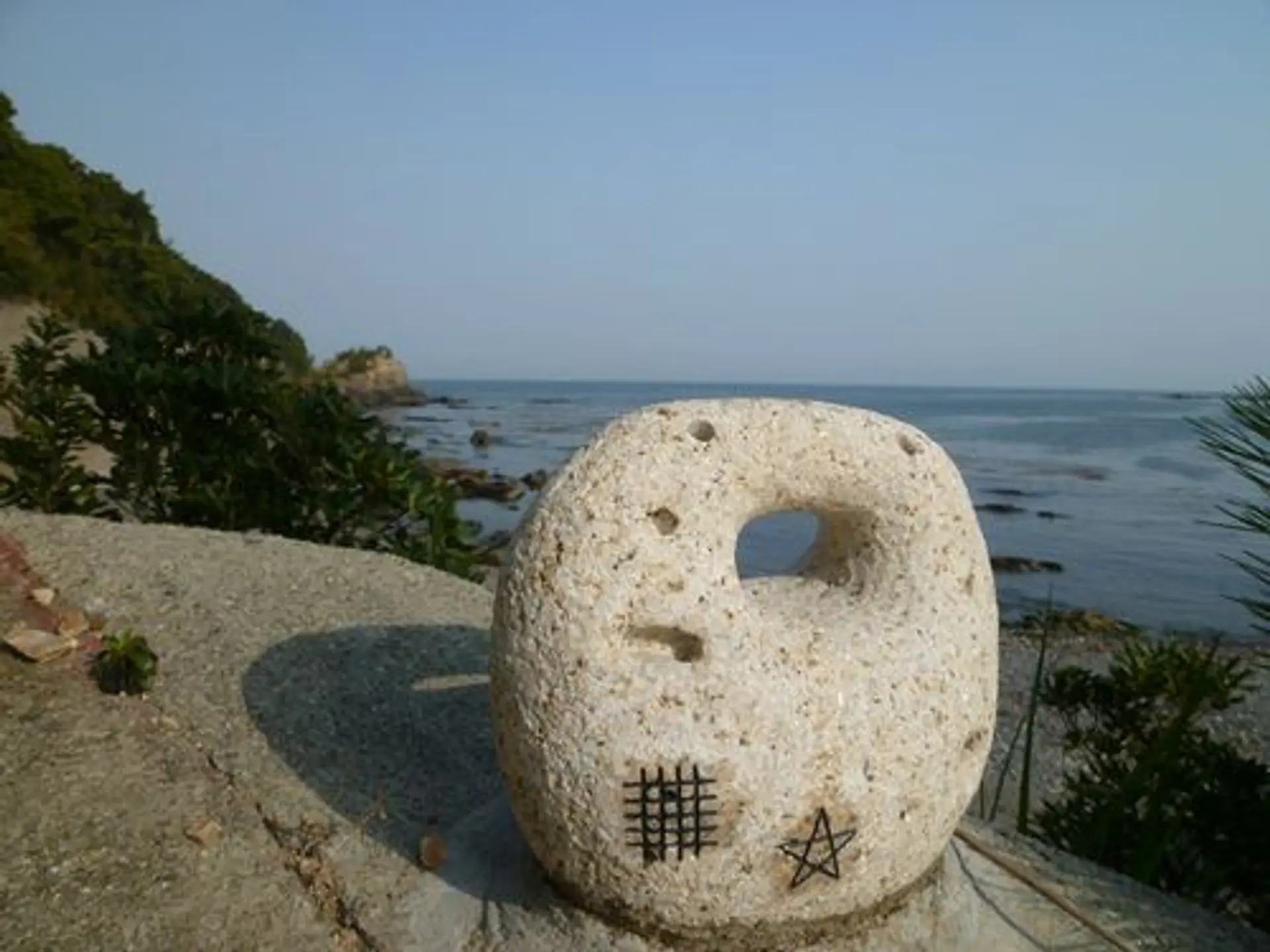 石神さんへの参道でも見かけたドーマン・セーマンの入った石いかりのオブジェを見て、遊歩道を「鯨岬」へと歩きました。その昔、鯨に乗った観音様が現れたという伝説からこの名前がついたそうです。