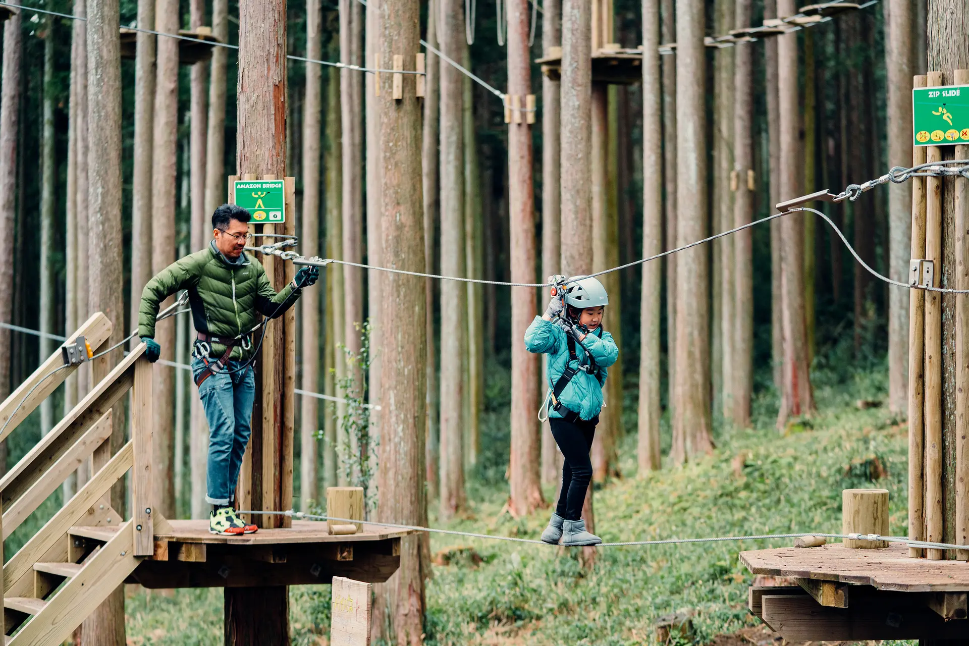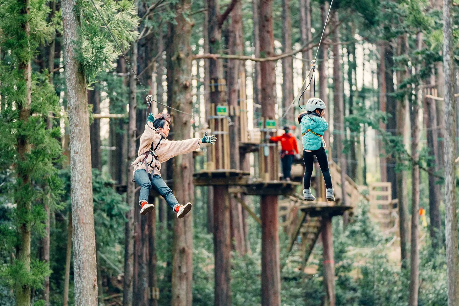 「アドベンチャーコース」の利用条件は、小学4年生以上もしくは身長140cm以上、体重130kgまでですが、「ジップトリップコース」は、身長110cmの小学生低学年から体験可能。