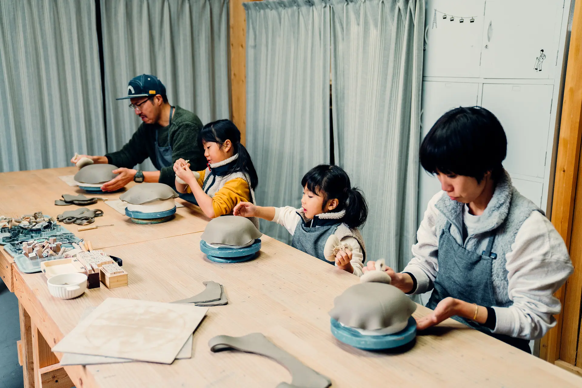 たたら成形による器づくり(1人3,000円/税別)にチャレンジ。好きな絵を描いたり、飾りを付け足したり…。最後に色を選んで終了。
