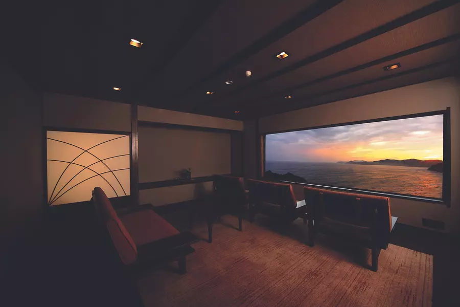 天空から地上に降りて、訪れたのは、みえ旅おもてなし施設の中の「宿泊施設」で一番人気、同じく志摩市の新浜島温泉にある「プレミアリゾート 夕雅 伊勢志摩」。伊勢志摩国立公園のほぼ南端にあたり、太平洋がすぐ目の前に迫ります。「日本の夕陽百選」にも選ばれた新浜島温泉の浜辺に佇み、海面を染める夕陽を眺めながら温泉や食事が楽しめる、まさに地上の楽園。このエリアでも由諸あるホテルで、伝統とモダンが融合したフロントの雰囲気に、グレード感が漂います。