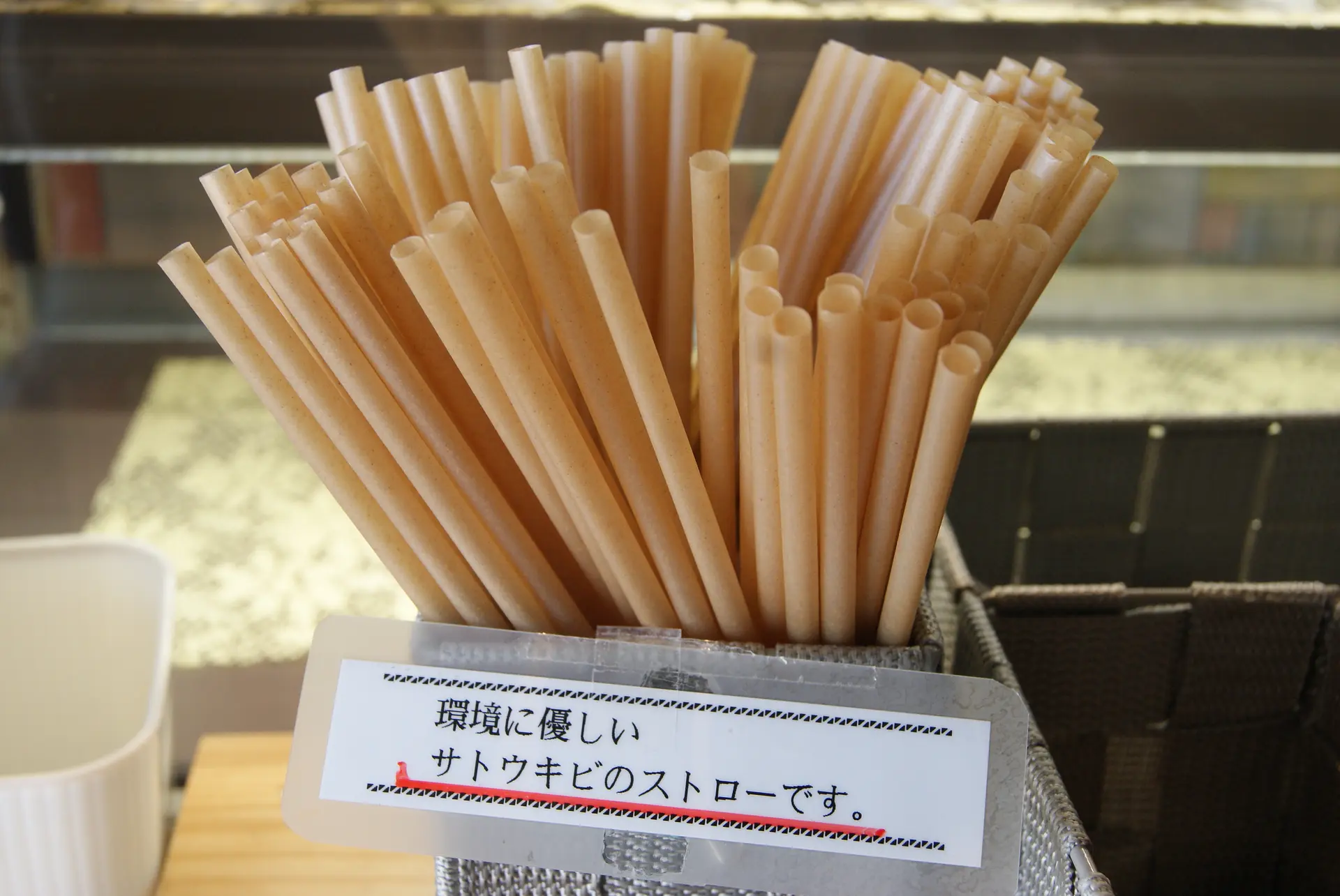 ストローの素材は、紙やサトウキビに切り替えました。ドリンクのカップもバクテリアで分解される植物由来プラスチックを採用し、カップのふたは付けていません。