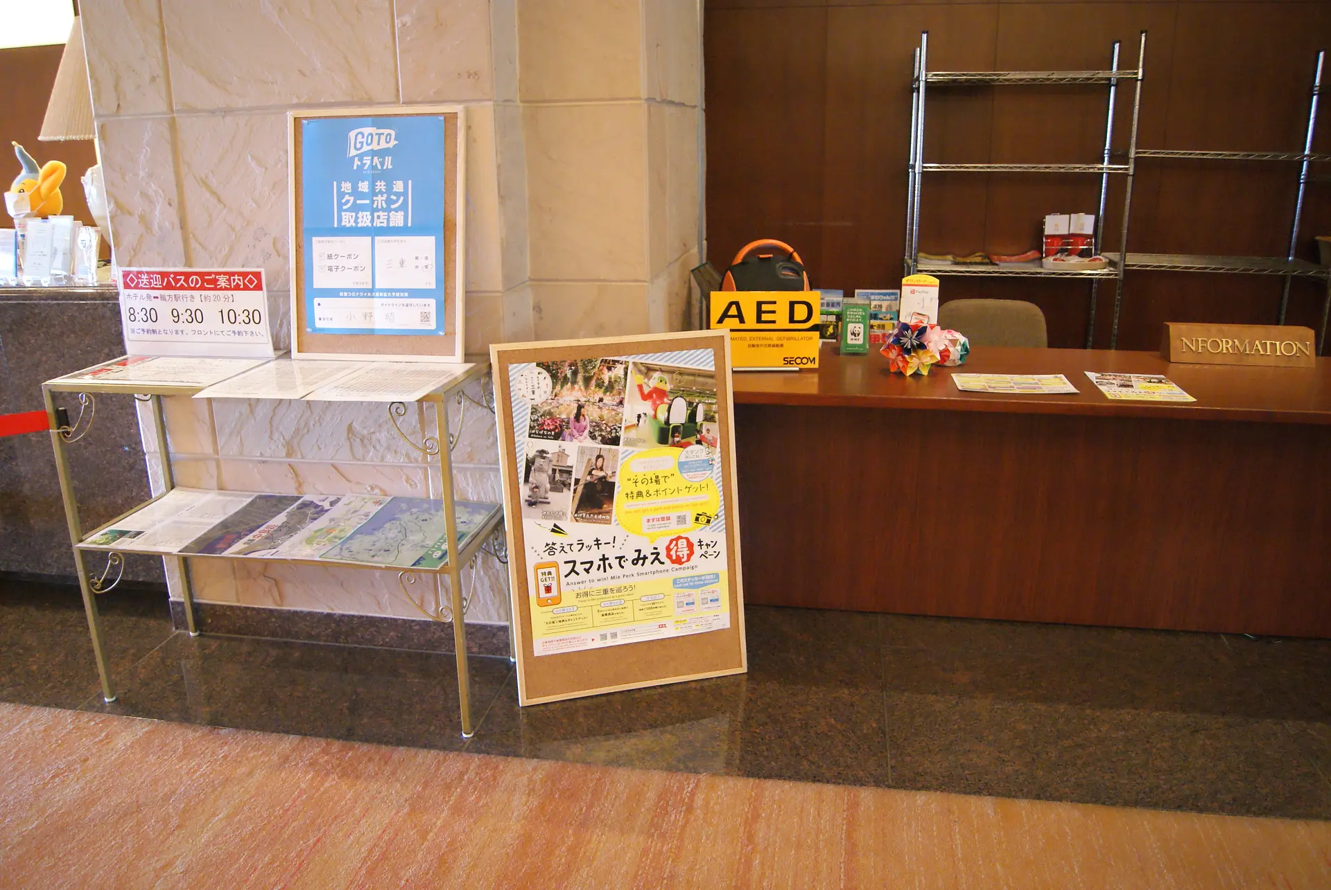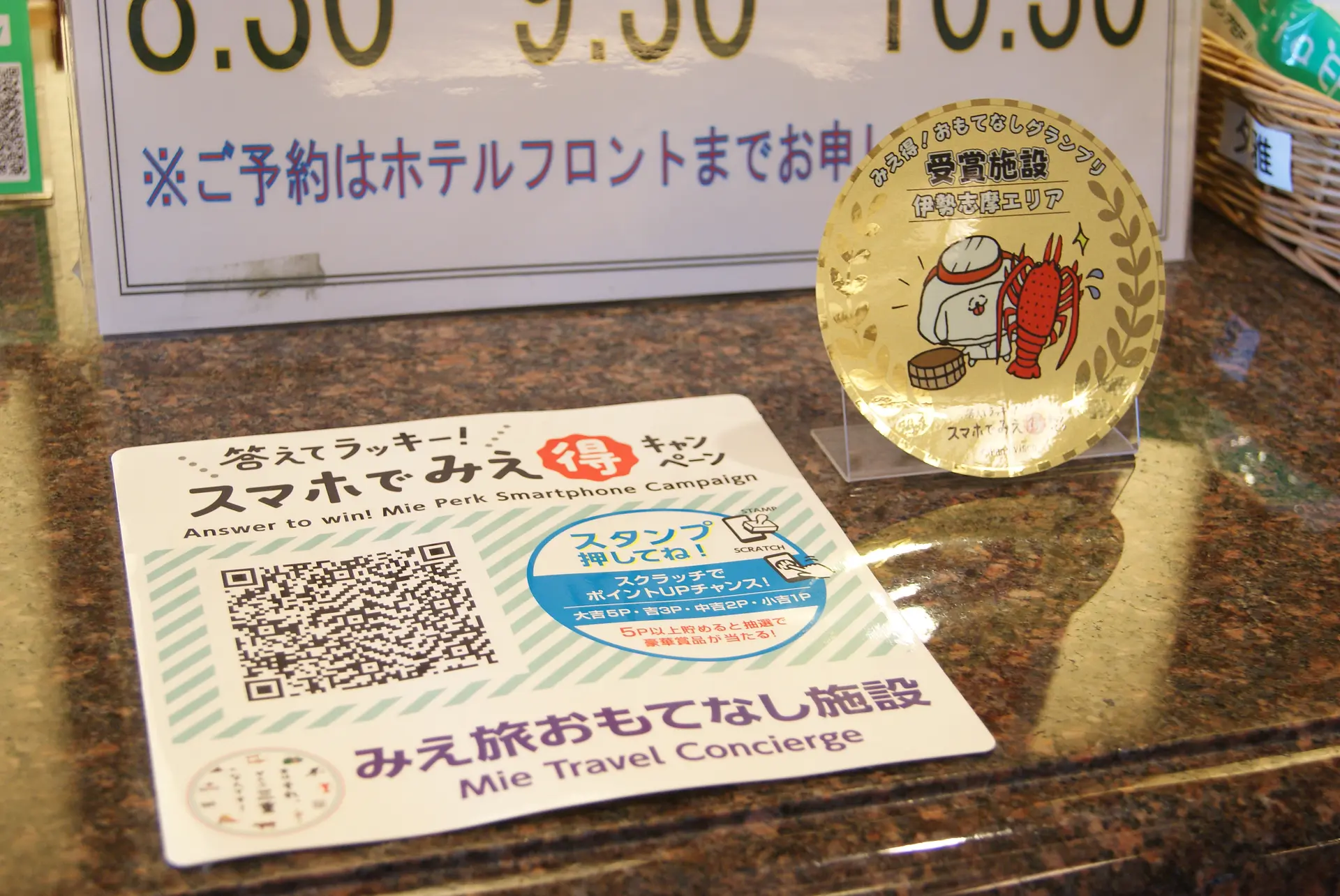 フロントのカウンターには、「スマホでみえ得キャンペーン」のQRコードと、「おもてなしグランプリ」入賞のシールが!