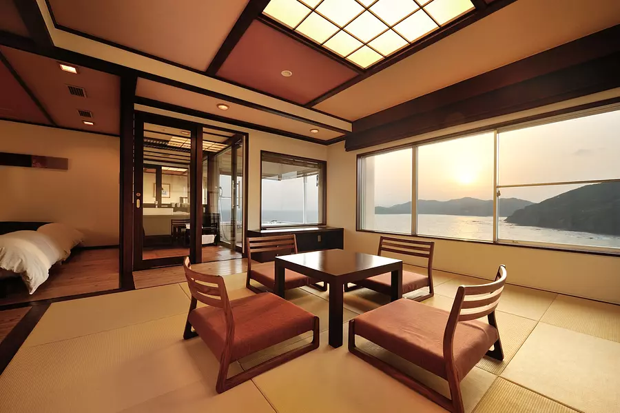 なかでも注目が、ビューバス付きの和洋室。海に囲まれた絶景ロケーションのビューバスは、開放感たっぷり。窓を開けて潮風を招き入れることもできます。モダンで落ち着いた和のリビング、ゆったりとしたベッドルームも魅力です。