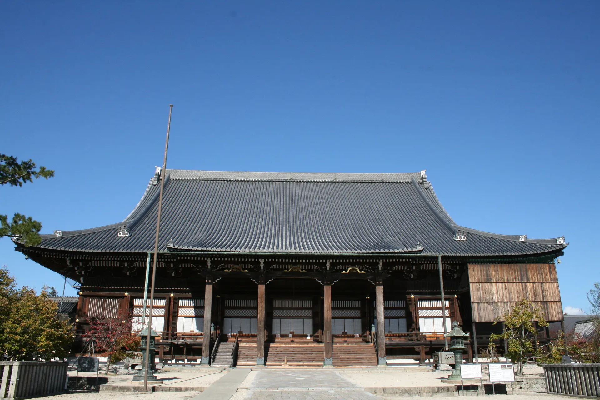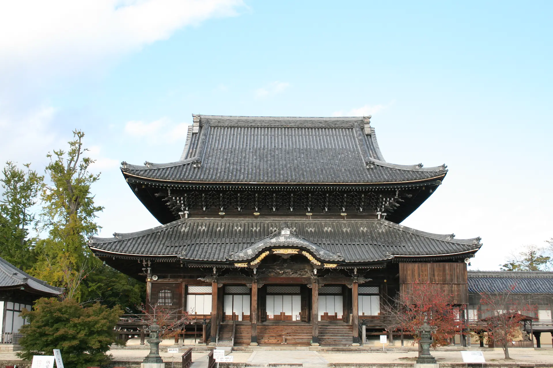 青空を背景に広大な敷地の中にそびえ立つ「御影堂」と「如来堂」。息を飲んでしばらく目を見開いたまま、立ち尽くしてしまいました。そんな圧巻の光景です。