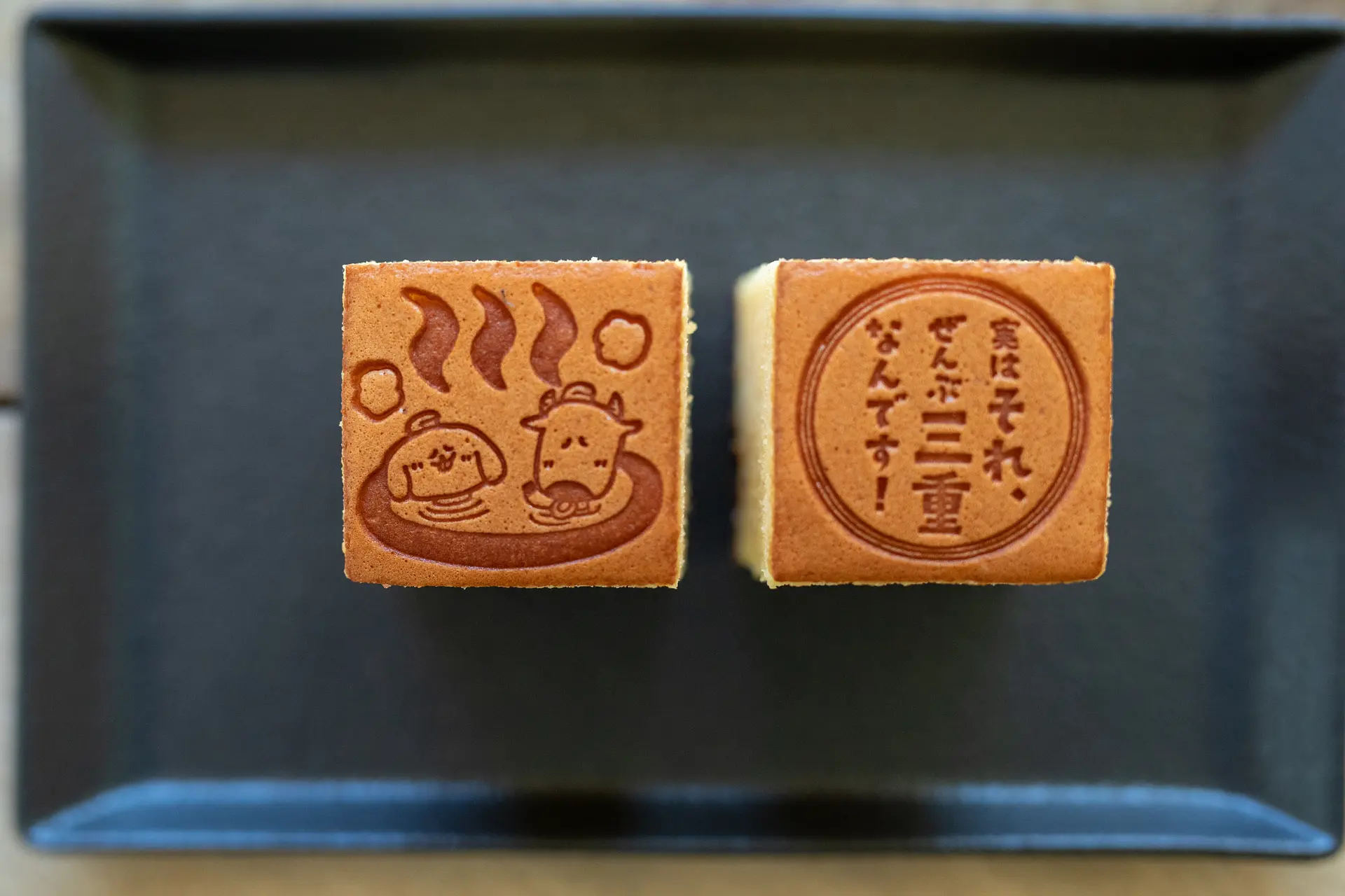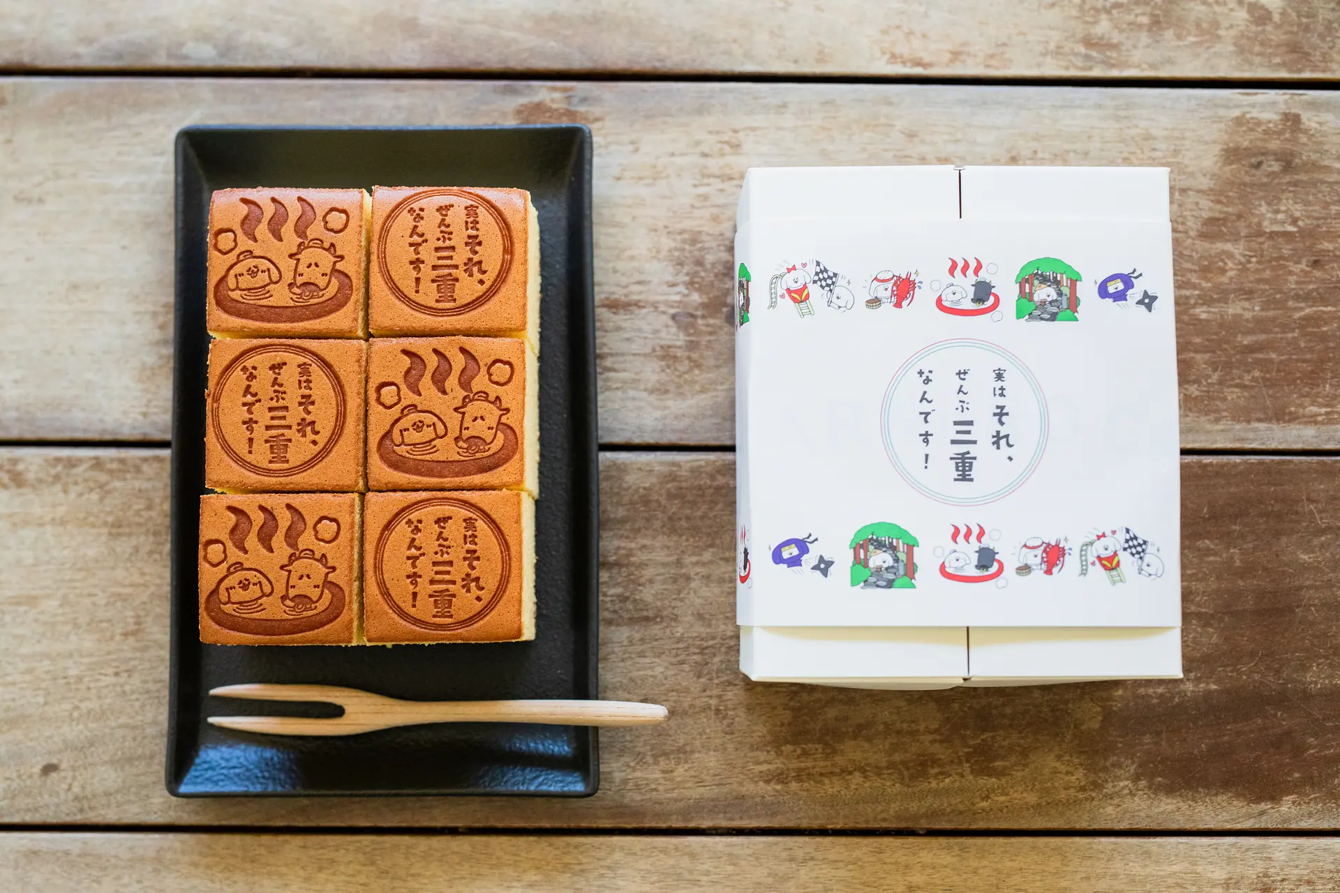 三重県産高級小麦粉のあやひかり、店舗毎に異なる産地より届くこだわりの卵、無添加の蜂蜜、四日市の百花蜜。鹿児島県産の天然粗糖など、こだわりの素材を使って焼き上げるカステラに、とてもユーモラスでかわいい焼印が特徴です。