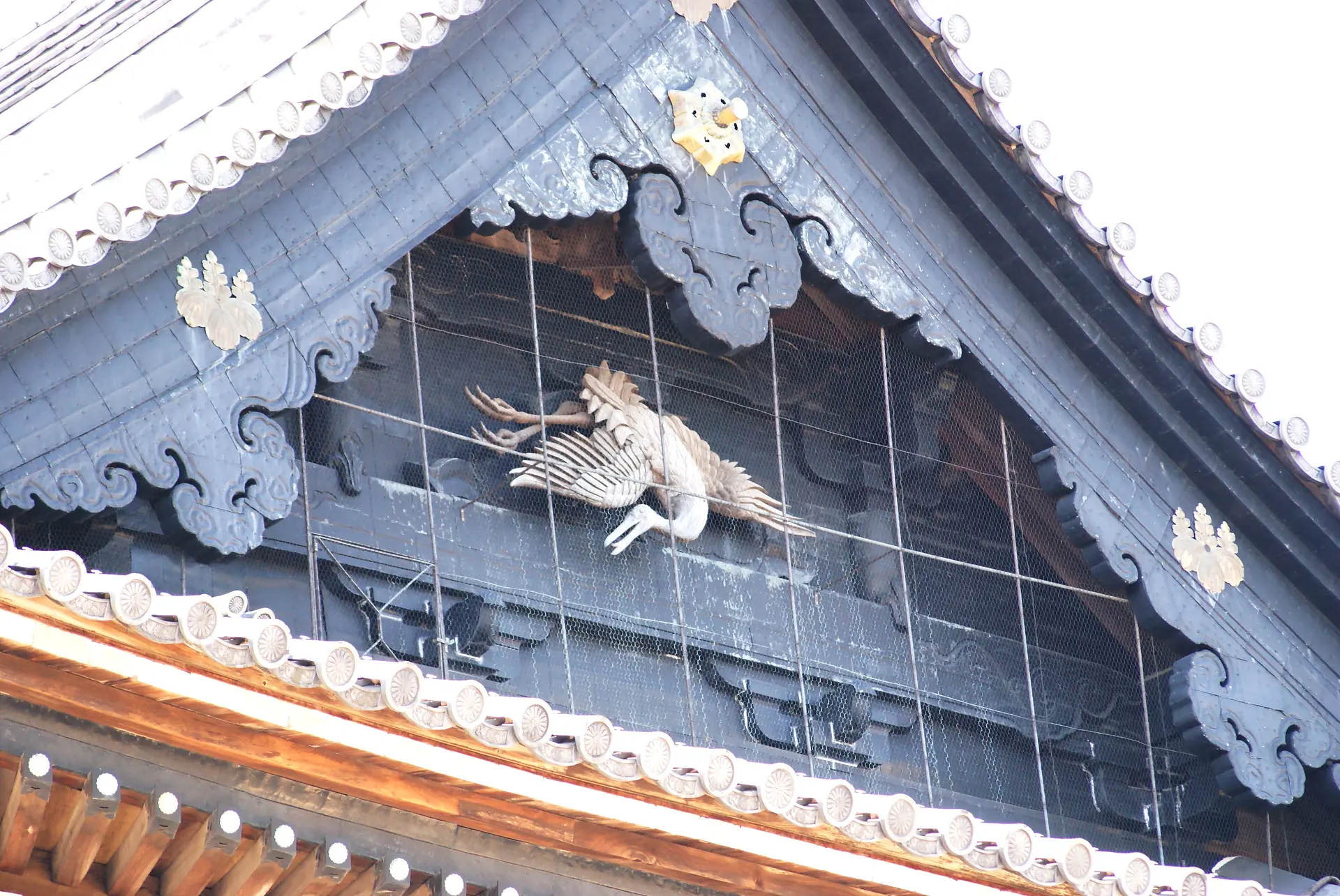 大屋根の東西で羽ばたく鶴の妻飾りは、江戸時代の初期に活躍したとされる伝説的な彫刻職人、左甚五郎(ひだりじんごろう)の作とか。また、屋根の軒裏にはたくさんの龍・獏(ばく)・象が!ひとつひとつ表情が微妙に異なるんですね。