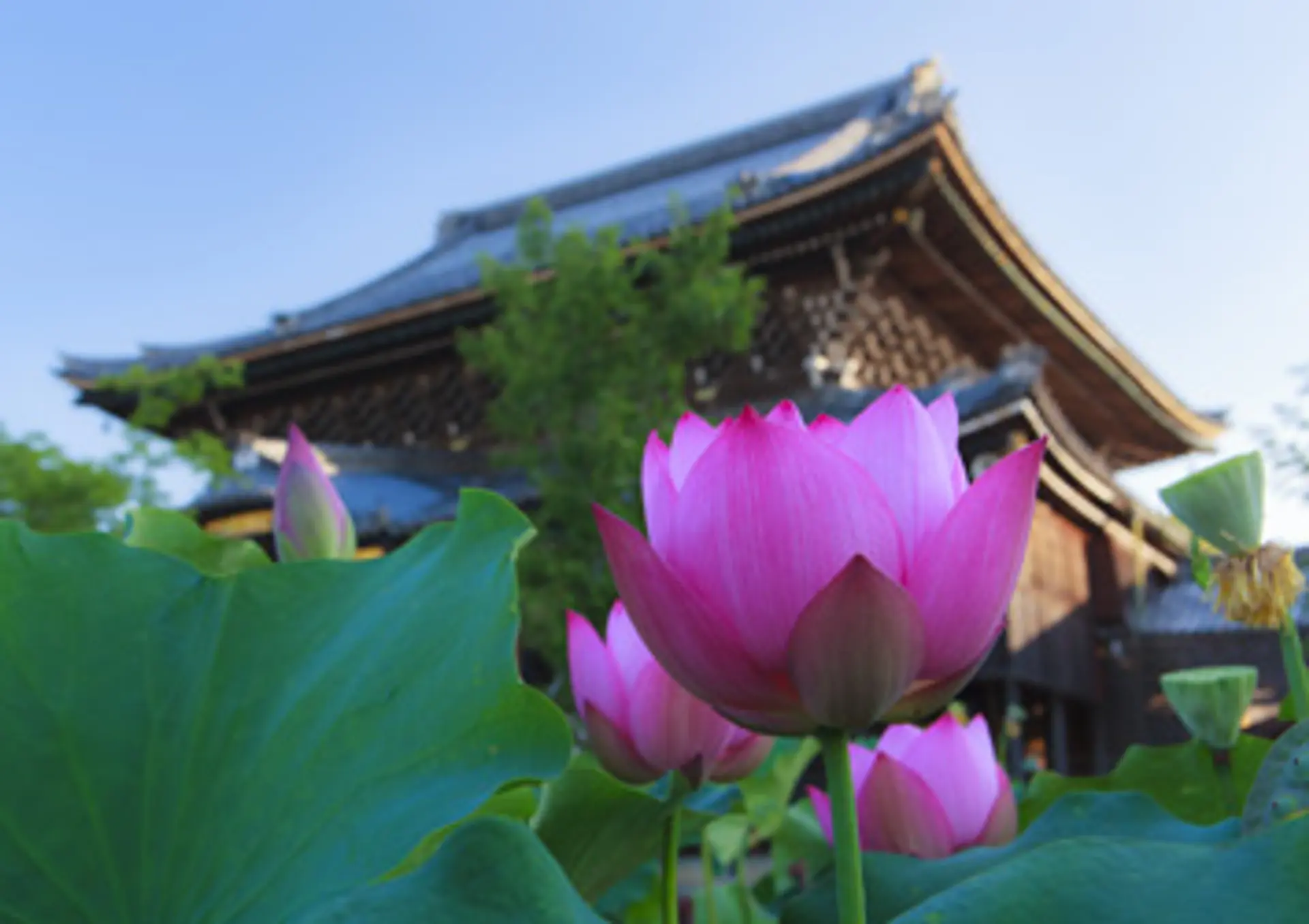 シーズンには蓮池では花が誇り、千株ほどの蓮が鉢植えにされて境内にずらりと並ぶんです。極楽で咲くという蓮の花を並べることで、お堂だけでなく境内にも極楽浄土を表現しようとしています」と玉野さん。