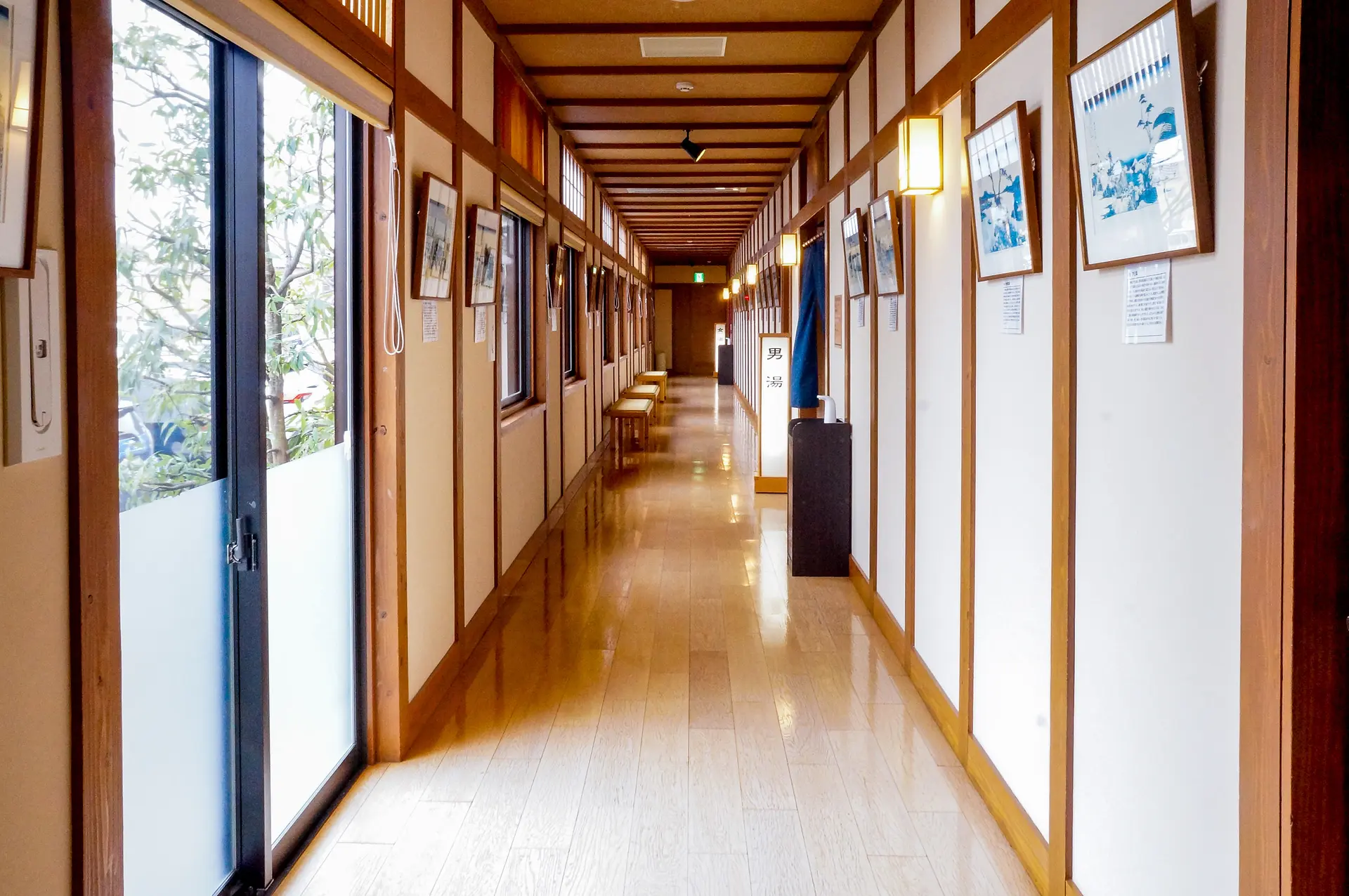 みたすの湯の特徴ともいえる全長27mの長〜い廊下は、お風呂場へ歩いていくうちに日常から非日常へと移り歩いていくようなイメージで造られたとのこと。
