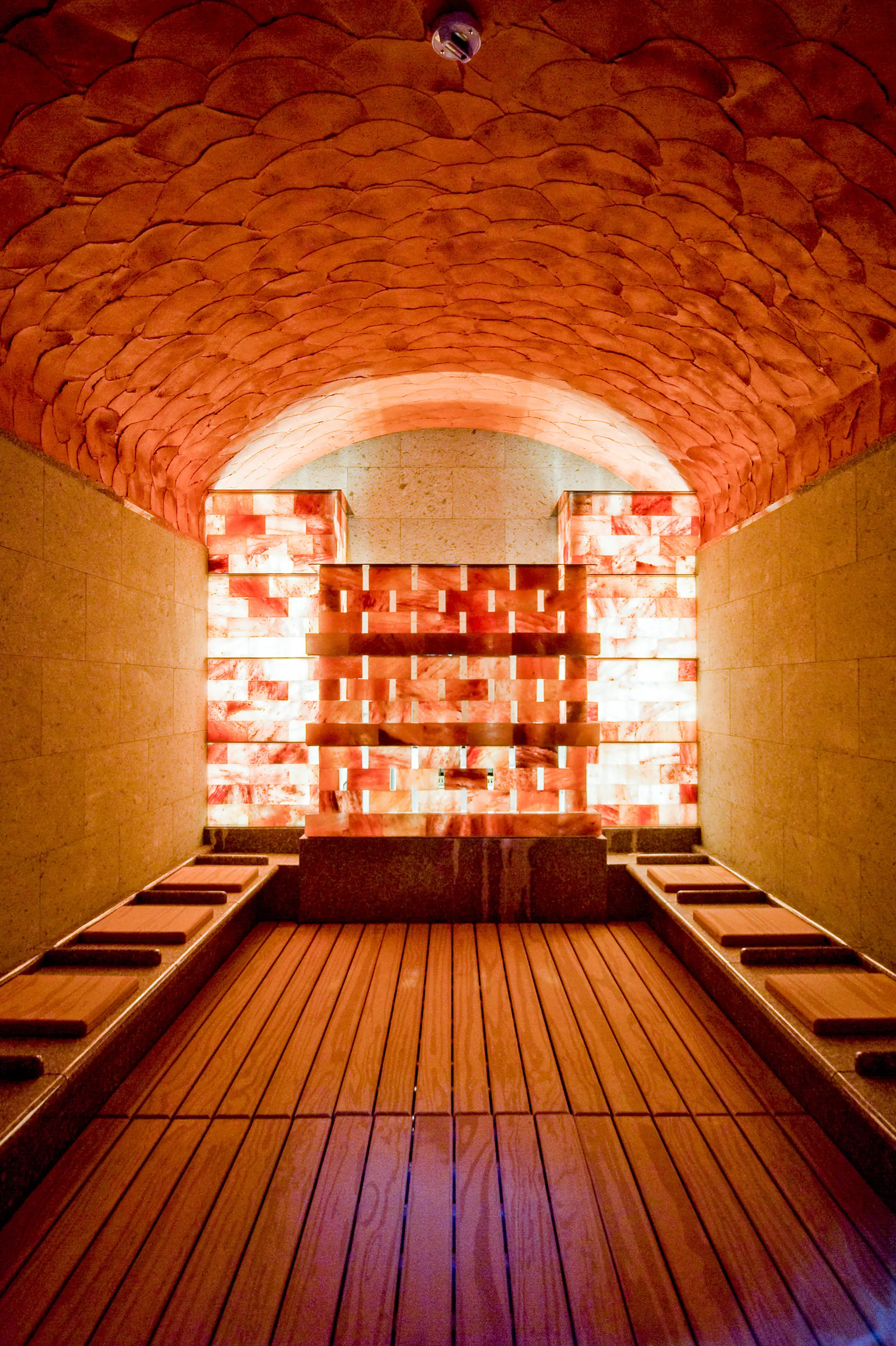 岩塩を積み上げ遠赤外線で温めた、ぬるめのサウナといった感じ。