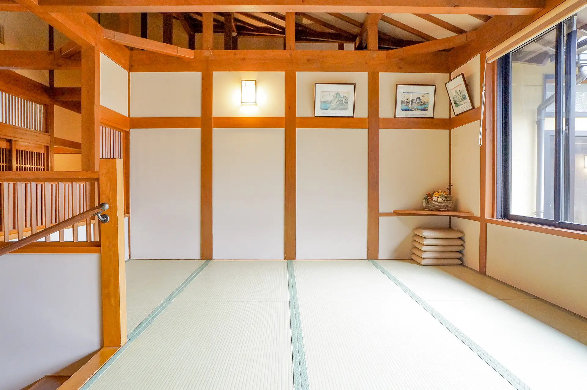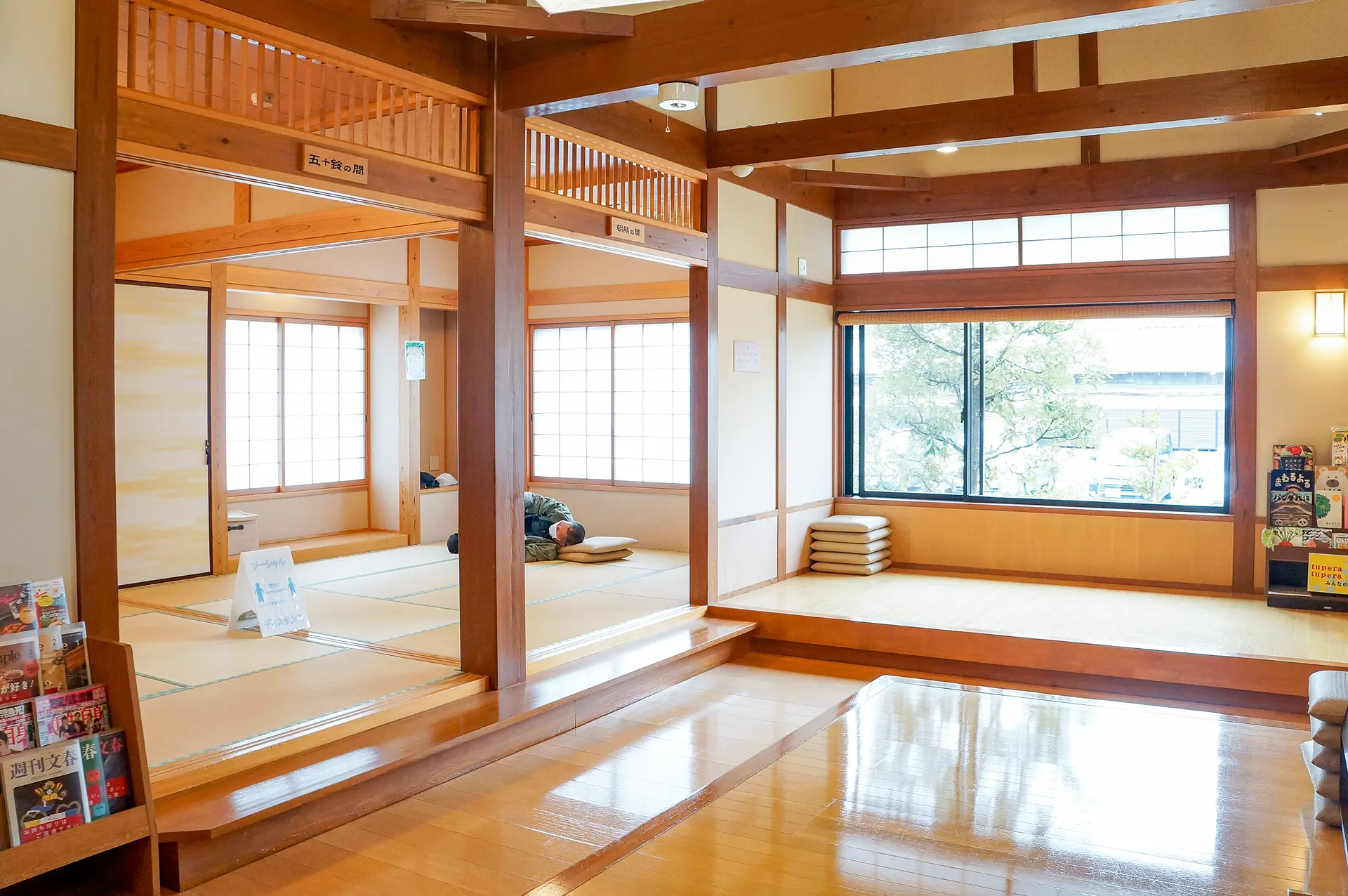 窓から中庭が見える休憩所「寝ころび処 南天の間」は、畳15畳分の広々としたスペースで、足を伸ばして座ったり、寝転んだり、思い思いにくつろげます。