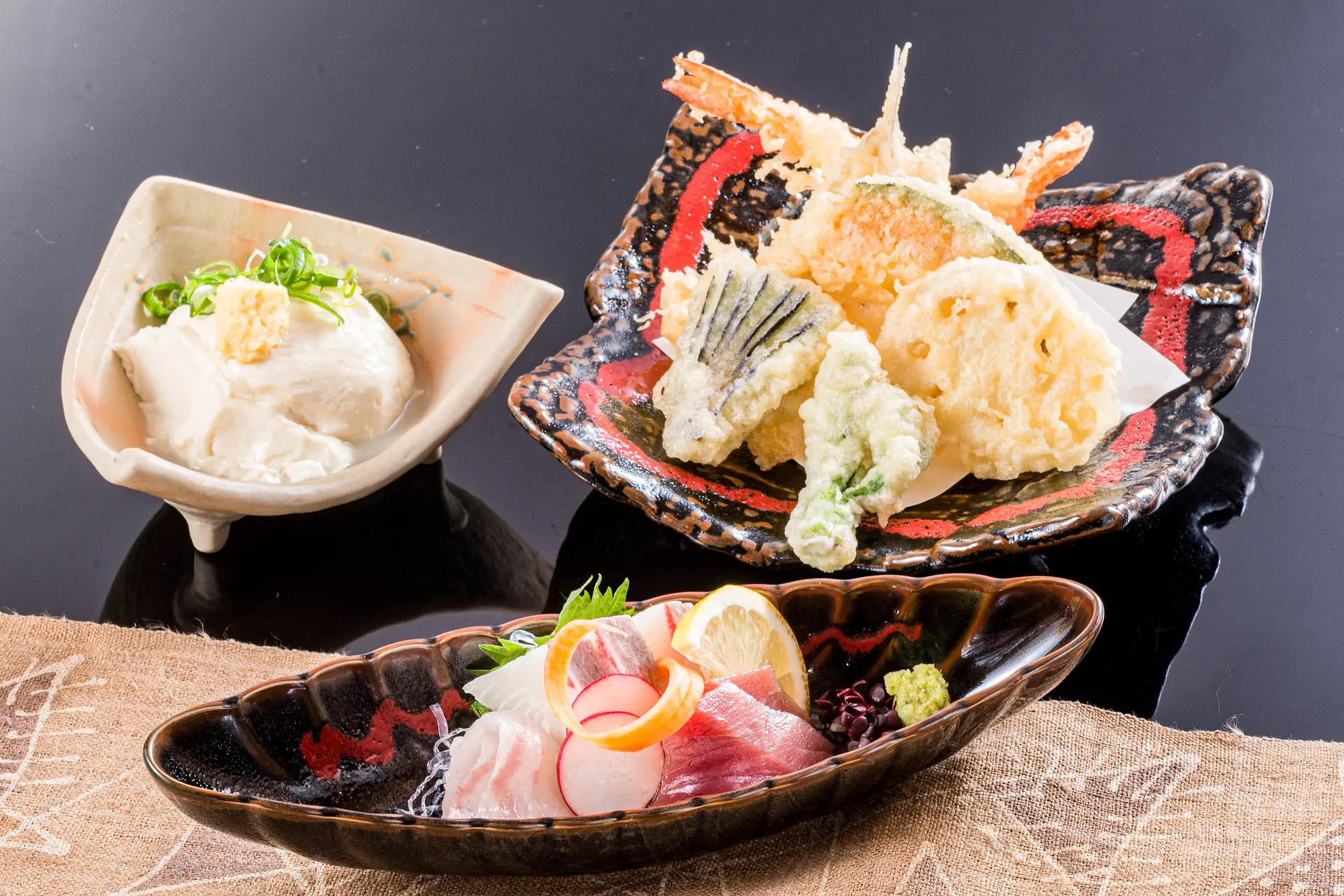 こちらの「ひょうたん膳」(1,580円・税込)は、お造り、天ぷら盛り合わせ、自家製豆腐、小鉢、ご飯、味噌汁、漬物がついた大満足の内容です。