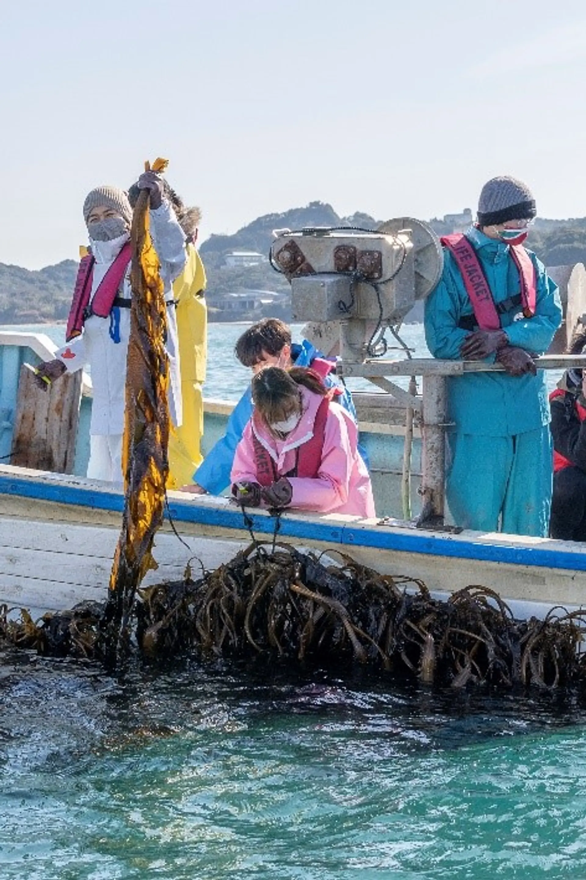 養殖現場に到着すると、養殖網いっぱいに生えたワカメを見ることができる。参加者は、漁師さんの手ほどきのもと自分の手でワカメを刈り取る。体験中も、漁師さんからは、ワカメの養殖方法や豊富な栄養分等について教えてもらえる。ワカメは、葉・茎・めかぶと余すことなくすべてを食べられるそうだ。