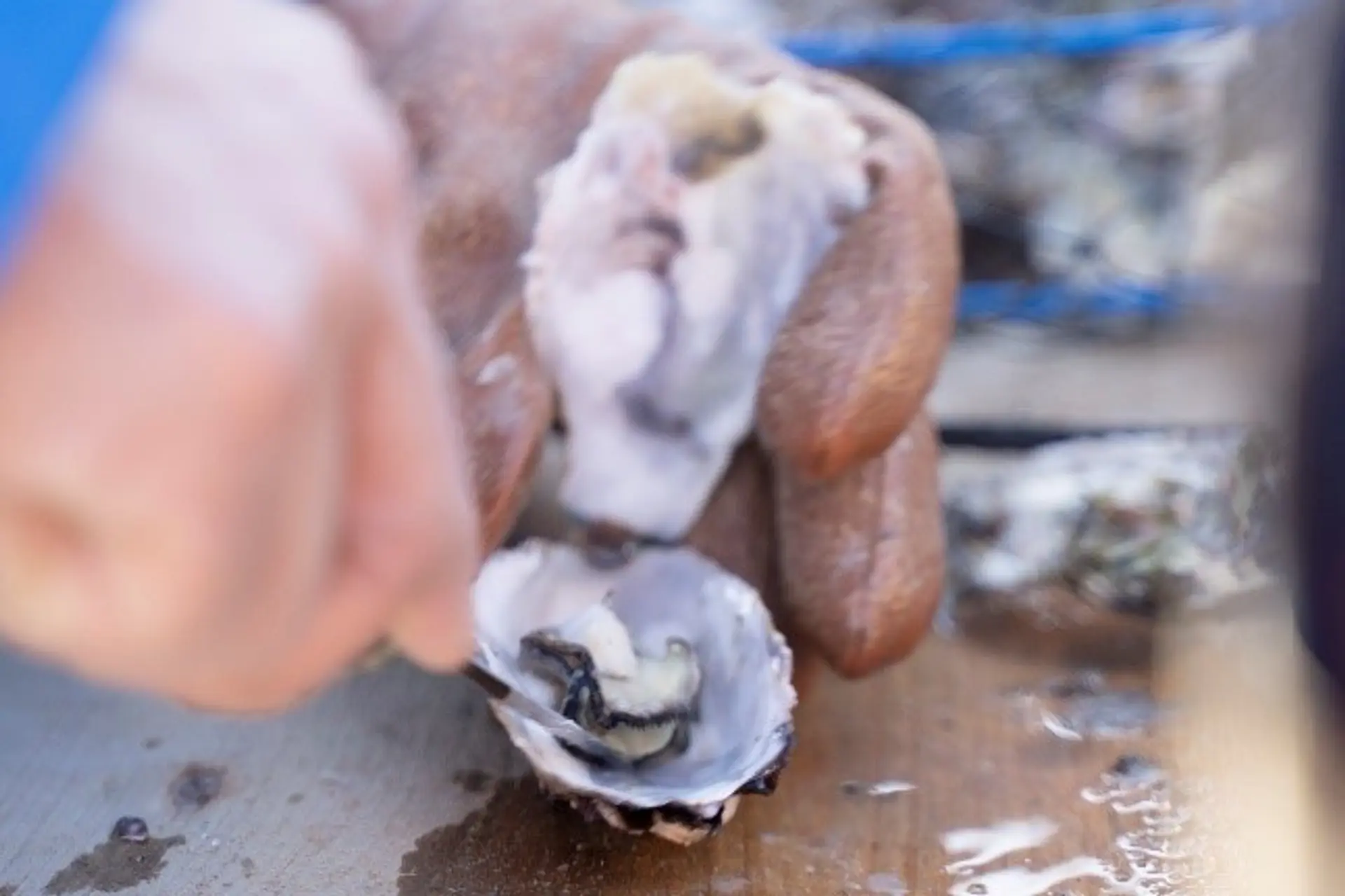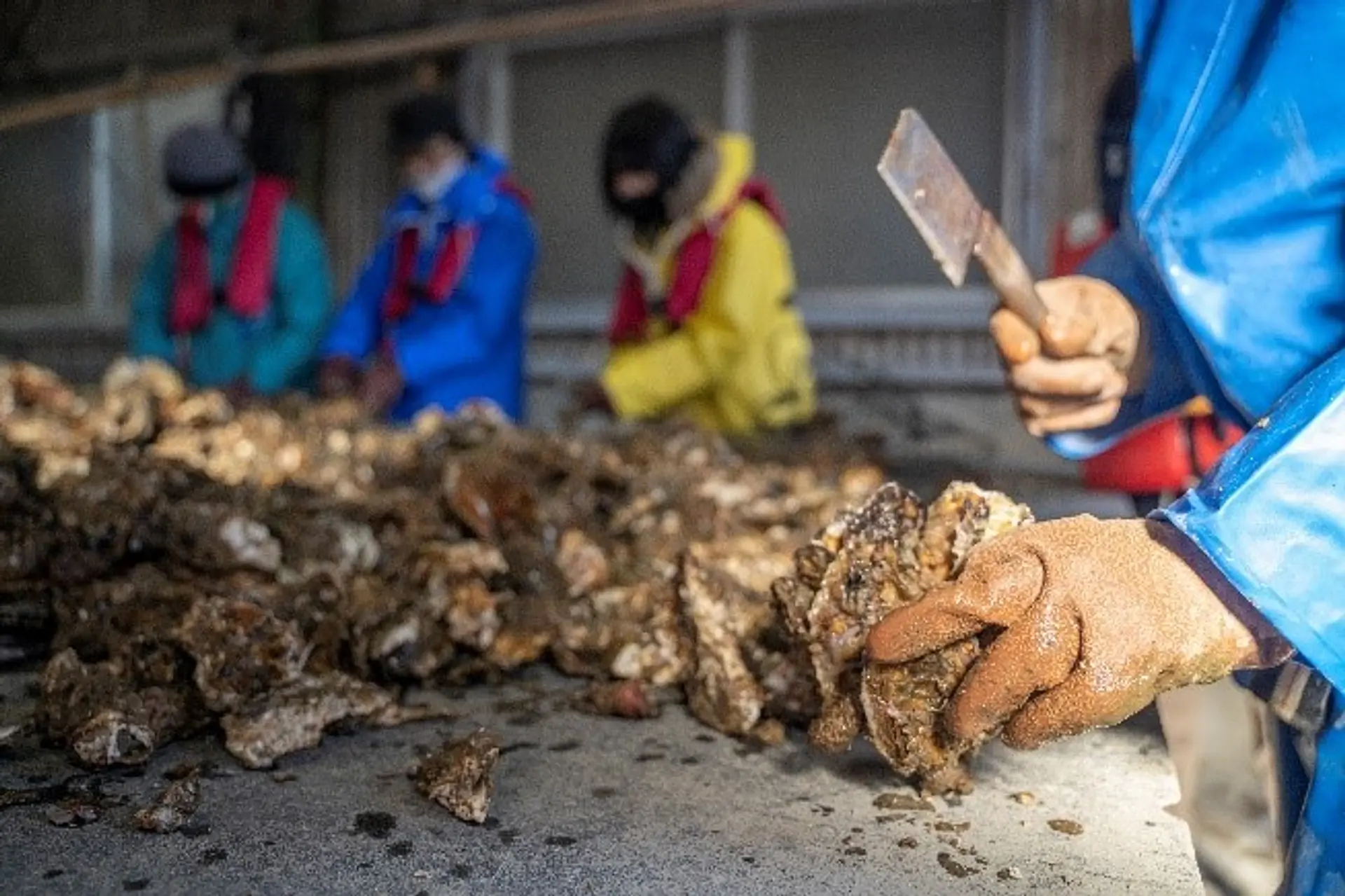 収穫された牡蠣を殻のまま洗浄機で洗い、泥や付着生物を取り除いた後、作業場に運ぶ。作業場では、くっついた牡蠣同士をコテではがしとる”牡蠣打ち”の作業を体験する。コツと慣れが必要な作業で、プロの漁師さんの素早い作業に目を引かれる。牡蠣打ちをしながら、漁師さんから牡蠣の養殖方法や豊富な栄養分、養殖イカダの場所によっては牡蠣の大きさや味が変わること等を、教えてもらえる。