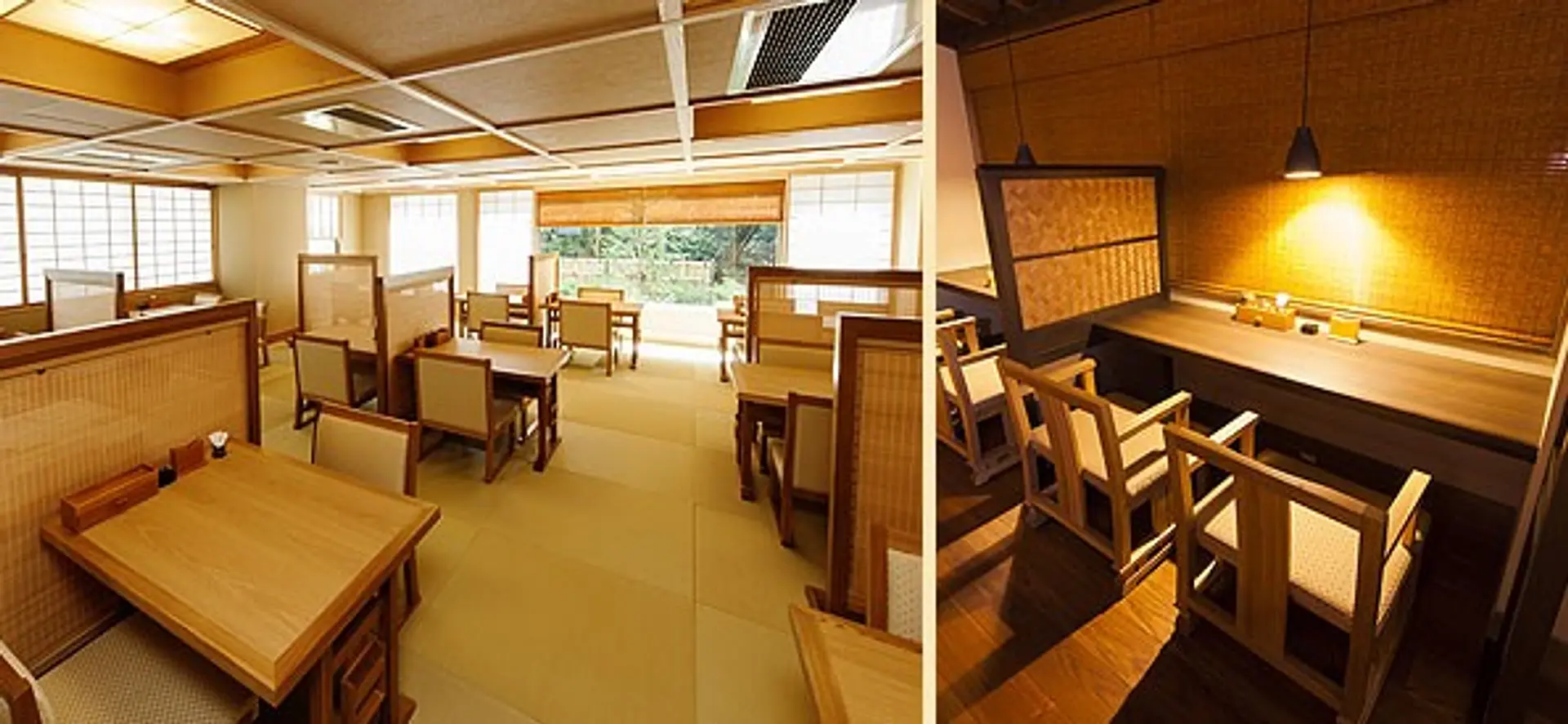 お食事処「祥山(しょうざん)」では、客席の間隔を1m以上確保する又は間仕切り等の飛沫飛散防止対策を実施しているので、安心して食事を楽しむことができる。