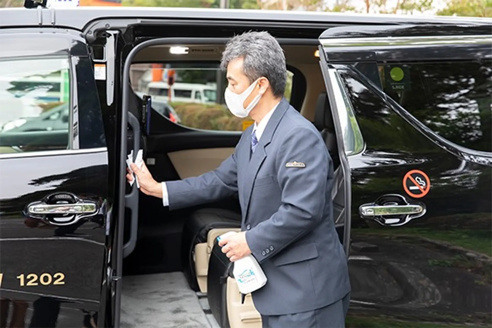 いにしえの宿 伊久では、お客様に安心して過ごしていただけるよう徹底した感染症対策を実施している。例えば、「自宅からリゾートへ直幸往復便」で利用するタクシー車内は、定期的な車内除菌を実施している。運転手のマスク着用・検温・体調管理も徹底しており安心だ。