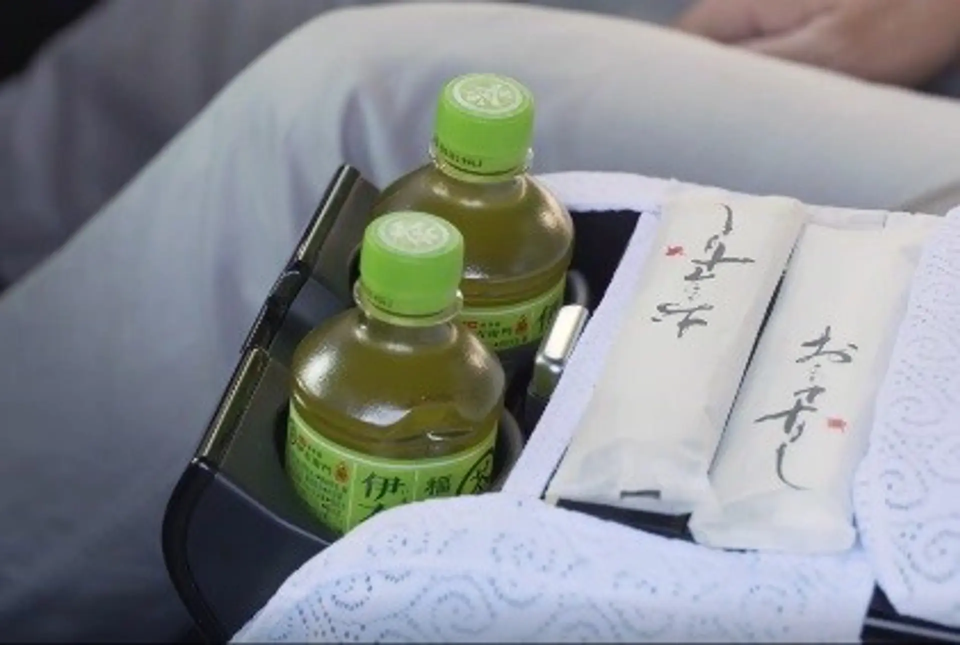 旅のスタートは自宅前から。アルファード等グレードの高いプレミアムタクシー※が玄関先まで迎えに来てくれる。車内にはドリンクとおしぼりがセットしてあり、リラックスできるような配慮が行き届いている。