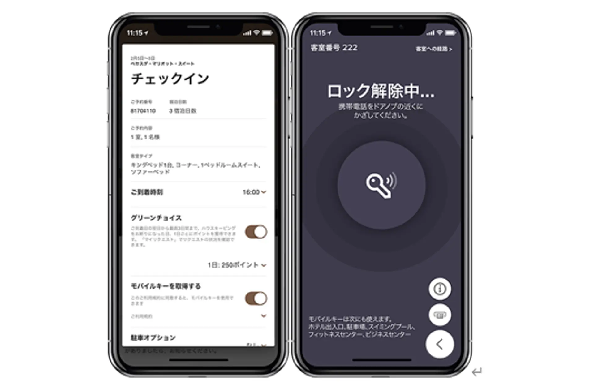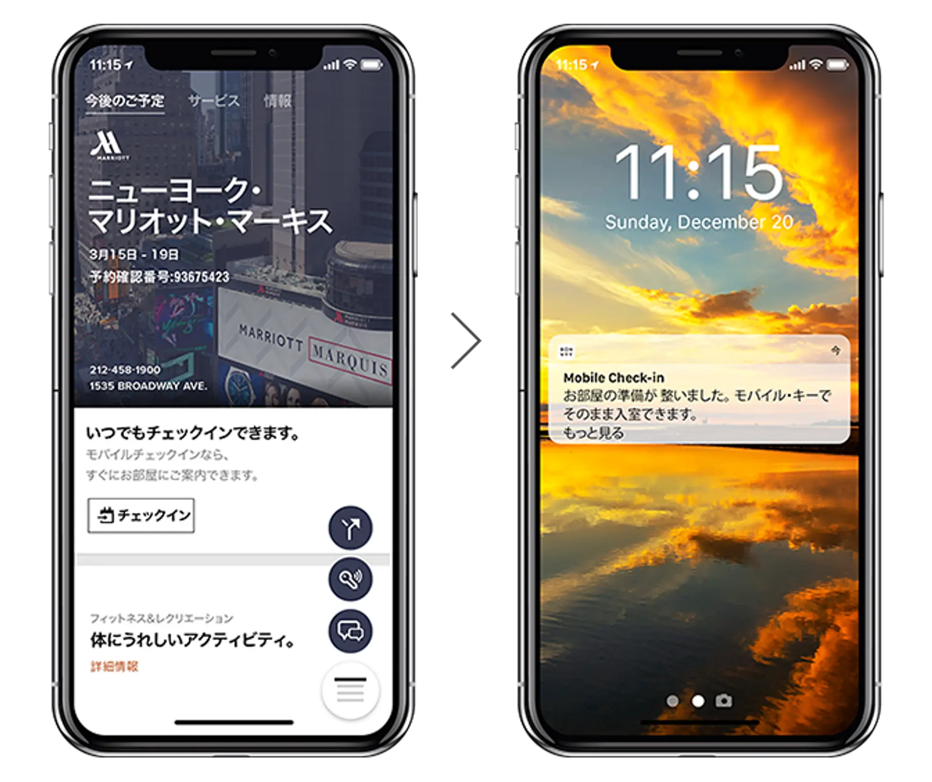移動中の隙間時間にワンクリックでチェックイン可能で、滞在する部屋の準備が出来次第、プッシュ通知でお知らせ。フロントでは事前精算のみの簡易な手続きで済み、到着してすぐに部屋でゆっくり寛ぐことができる。iPhoneやApple Watch、Androidの携帯電話で部屋のロックが解除され、ルームキーを持ち歩く煩わしさもない。