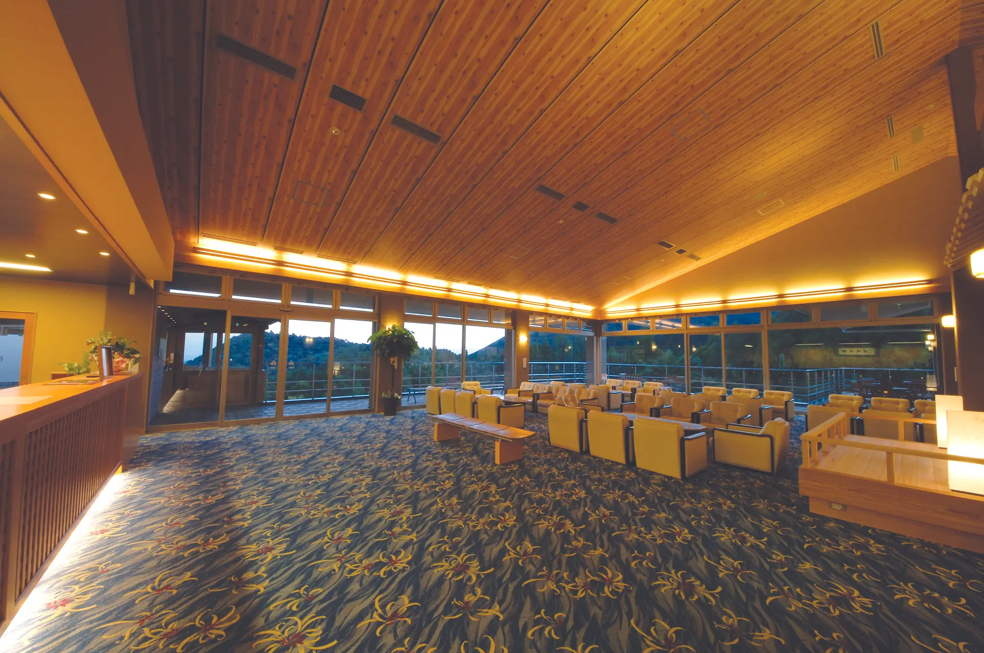 木のあたたかみが感じられる山上館のロビー。ほっと一息つける雰囲気です。