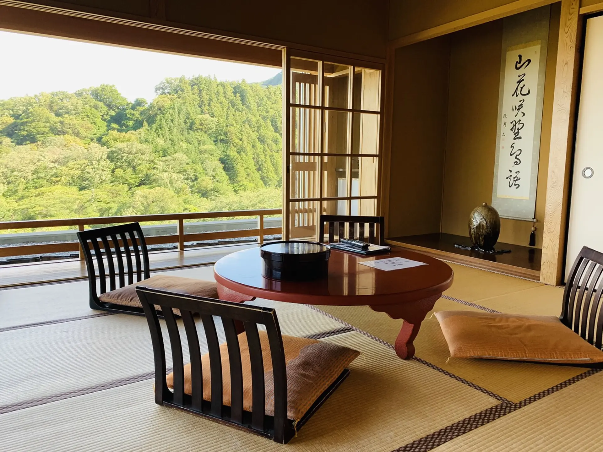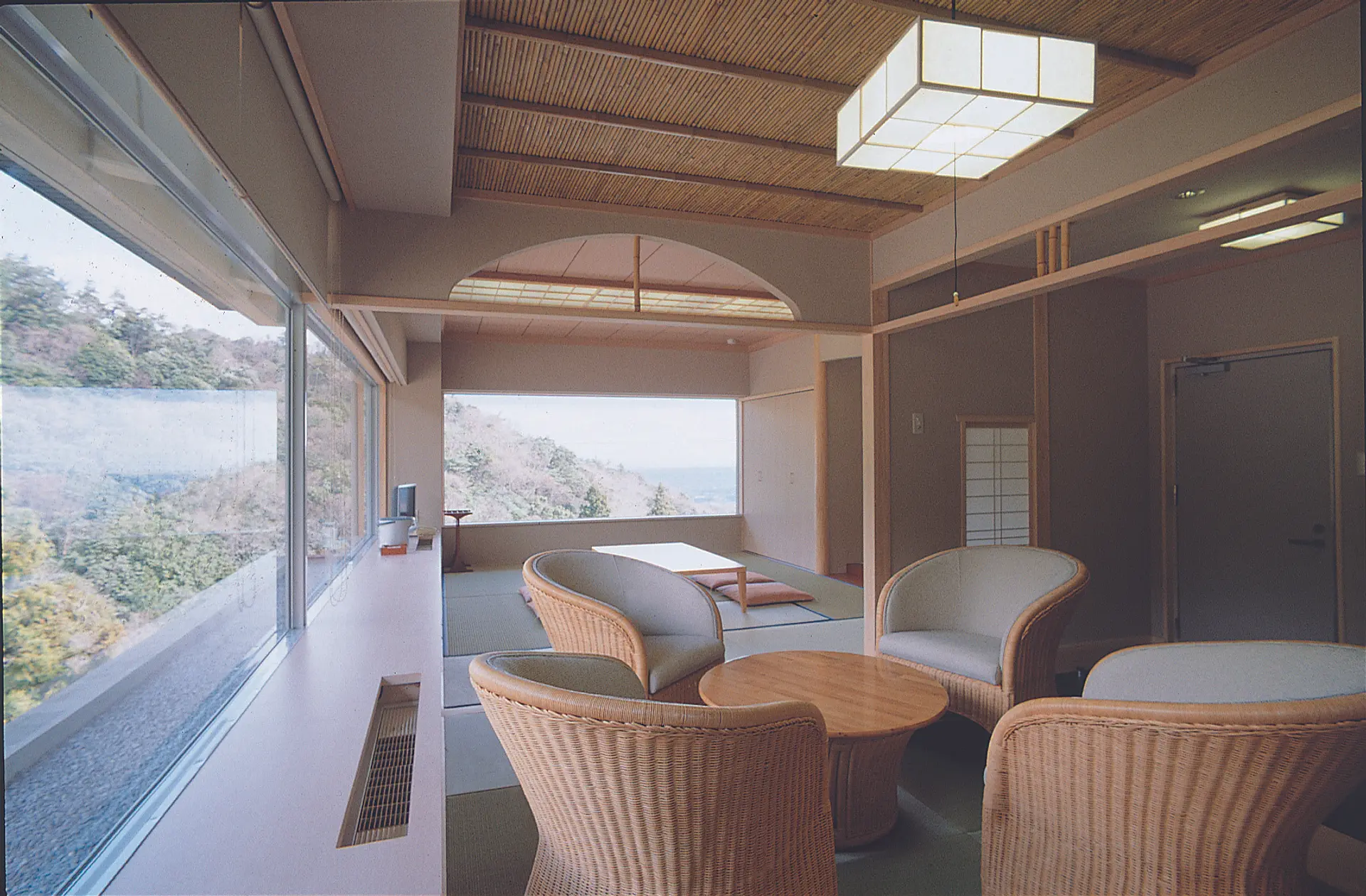 写真に写っているのは、ホテルの機能性と旅館のくつろぎを兼ね備えた、3階の和洋室(定員8名)。ワイドビューの窓は、開放感たっぷり!