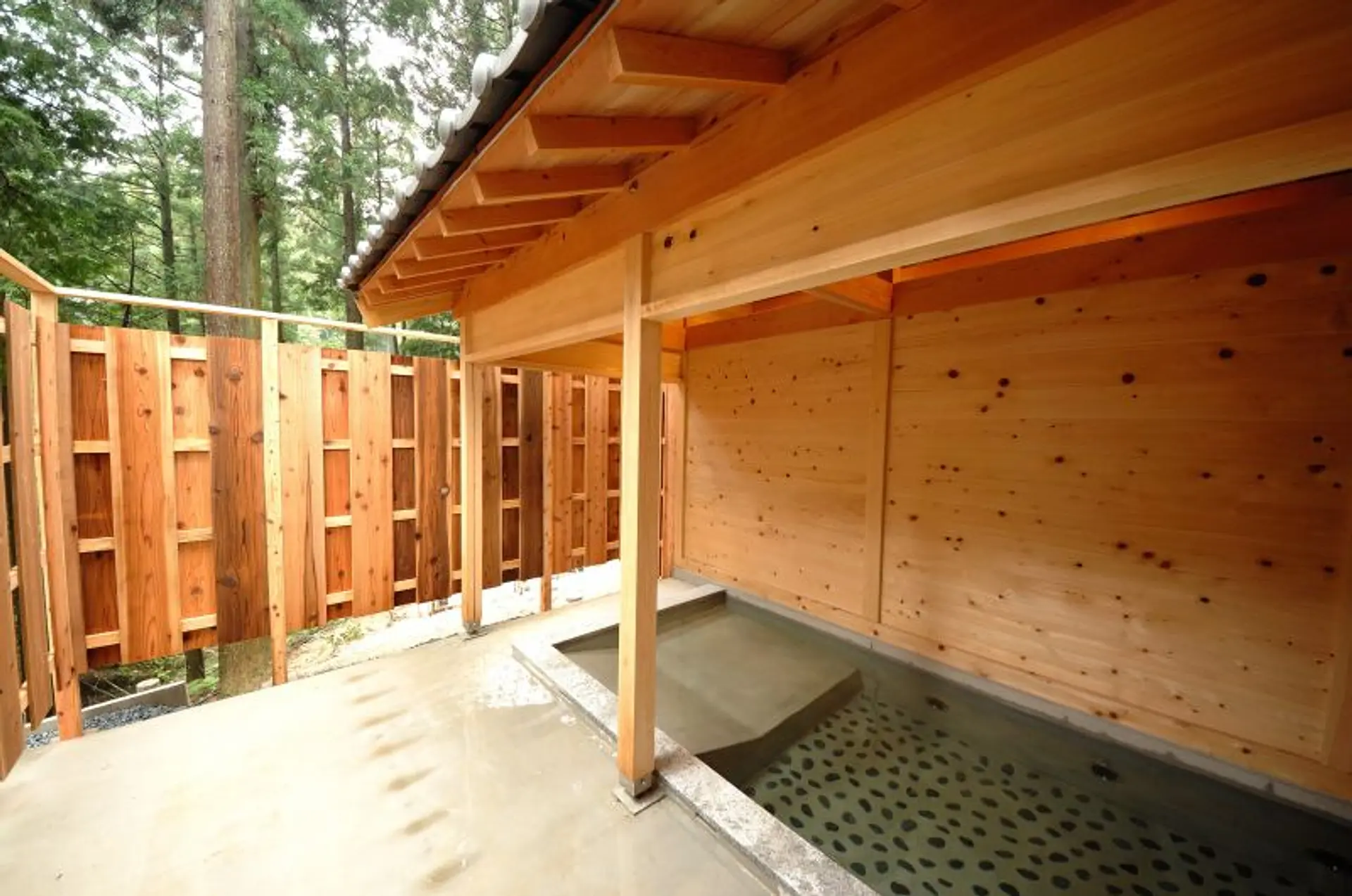 「木漏れ日の湯」は、桧の香りが漂う浴室。山懐に抱かれた静けさの中で味わう「隠れ家の趣」を堪能。