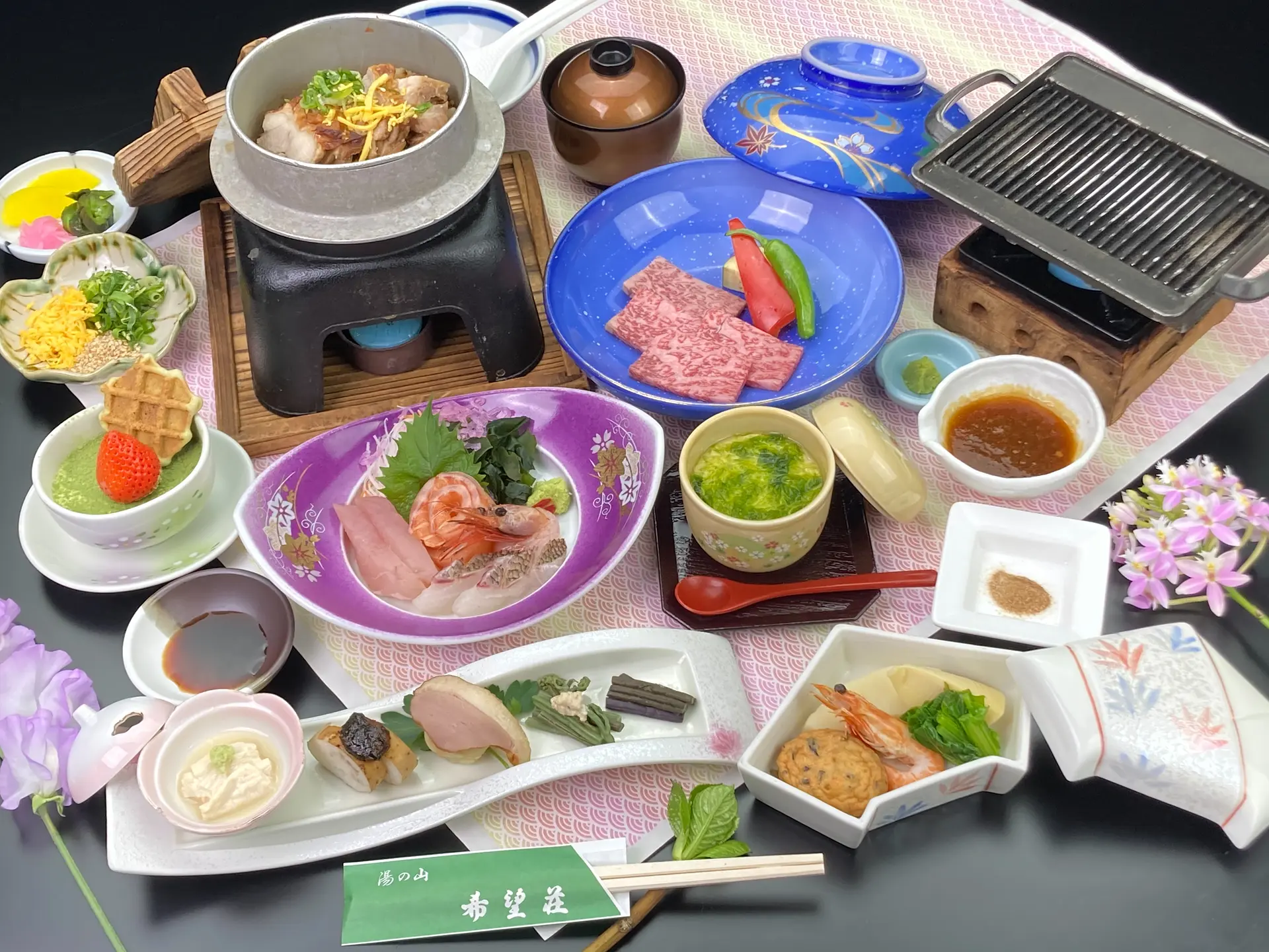 夕食は、旬の食材をふんだんに使った華やかな会席料理を! スタンダードな「希望会席」は、A5ランクの黒毛和牛、カツオの藁焼き、季節のデザートなど、一品一品料理が運ばれるたびに心が躍ります。