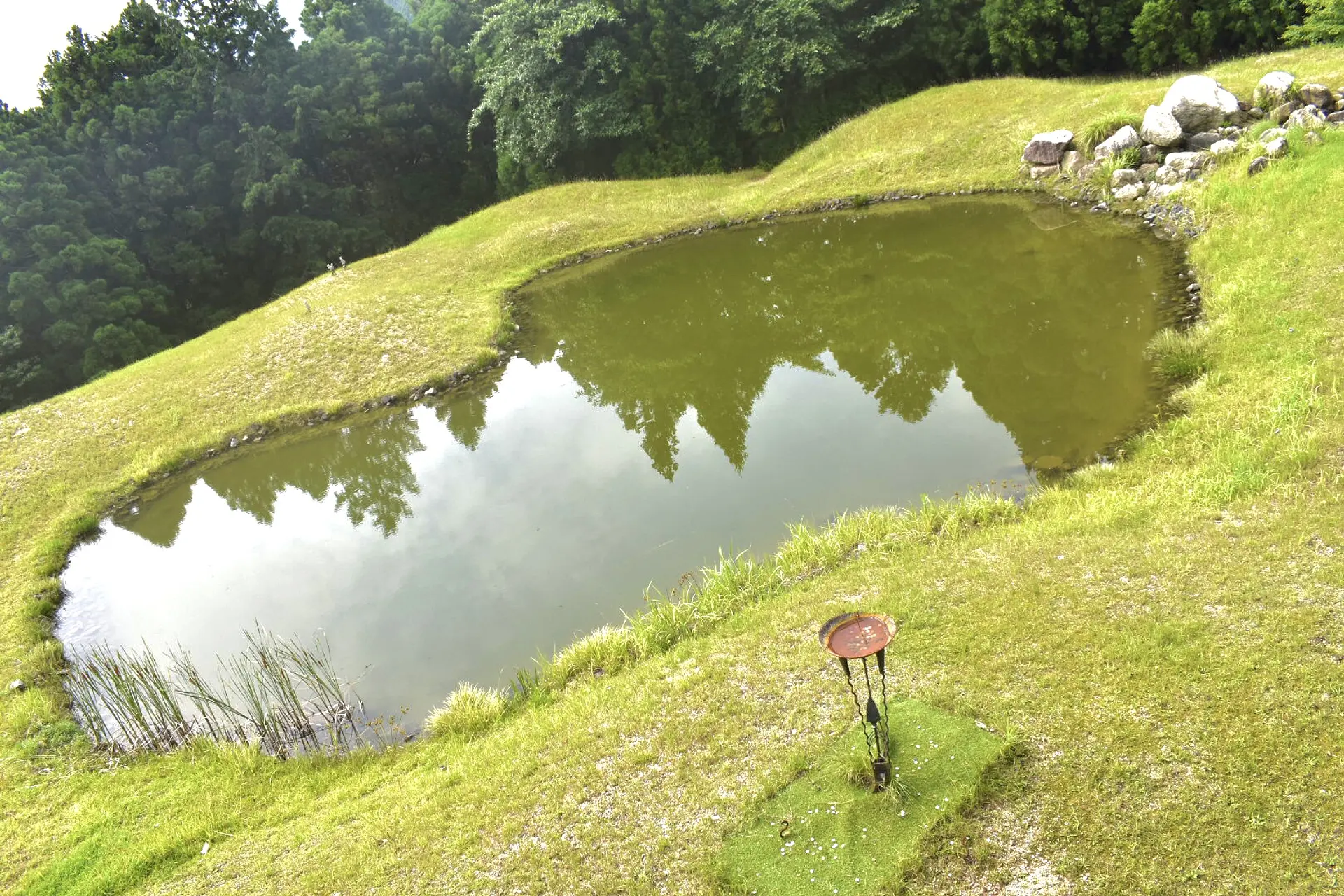 山上館の展望デッキには、もう一つ楽しみあります! 目の前に見えるのは通称「ハートの池」。手前に設置された器にコインを投げ入れることができれば、恋愛が成就するといわれるパワースポットです。