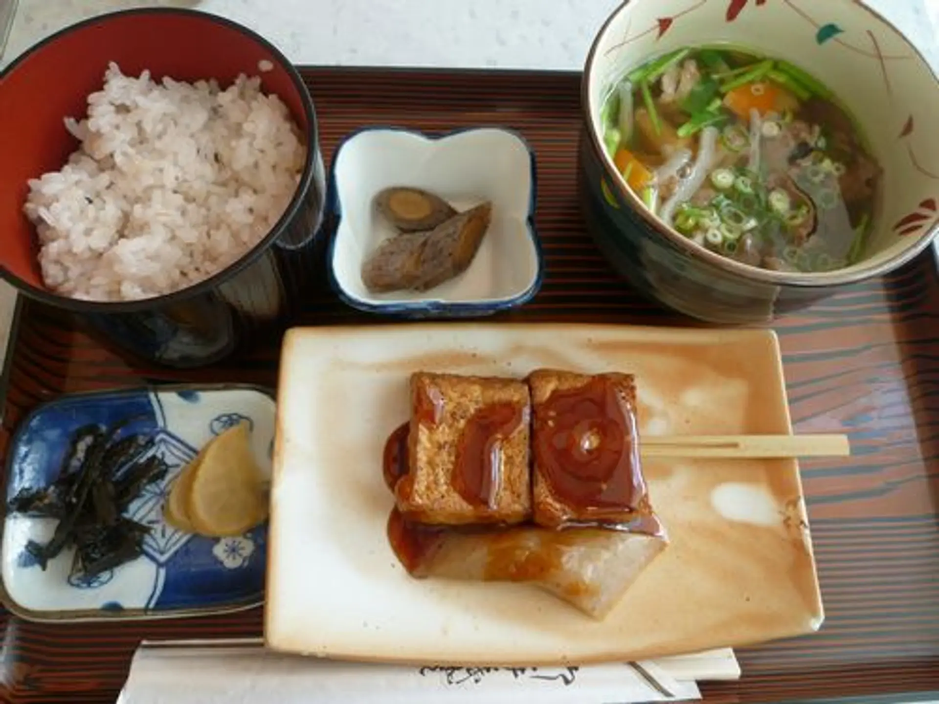 田楽や五穀米ごはんなどがついた牛汁御膳(1000円)をいただきました。大日屋さんの牛汁は、かつお昆布だしのやさしい味で、伊賀牛と野菜がたっぷりと入った具だくさん。とってもおいしかったです。ごちそうさまでした。