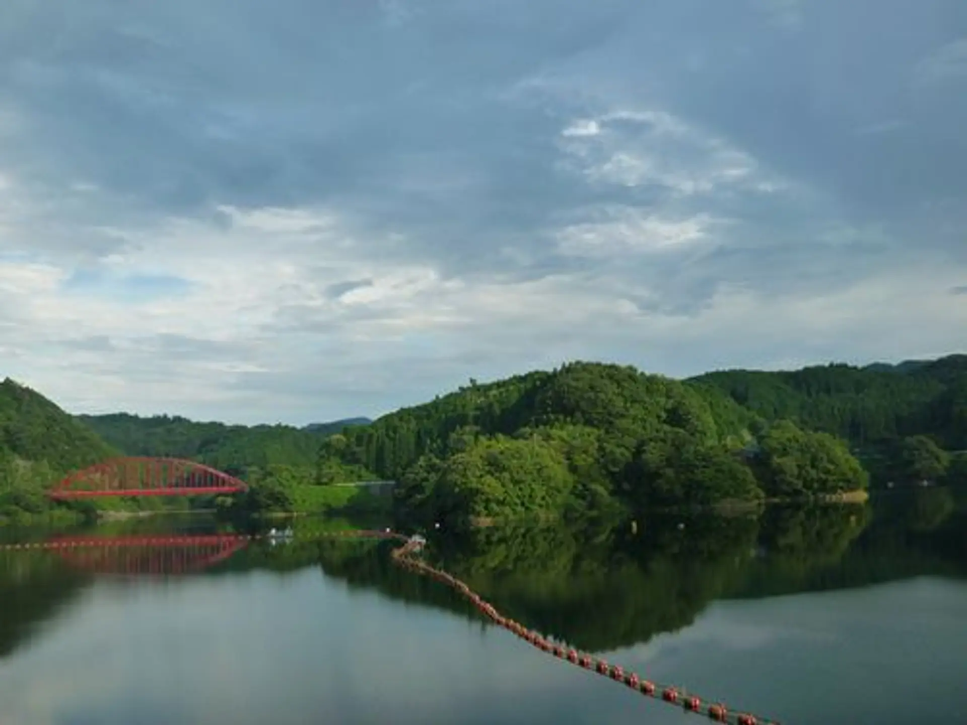 緑豊かな青蓮寺湖。この日のように穏やかだと、鏡のように湖面に山や橋が映えます。この先を行くと、紅葉の名所・香落渓(かおちだに)です。