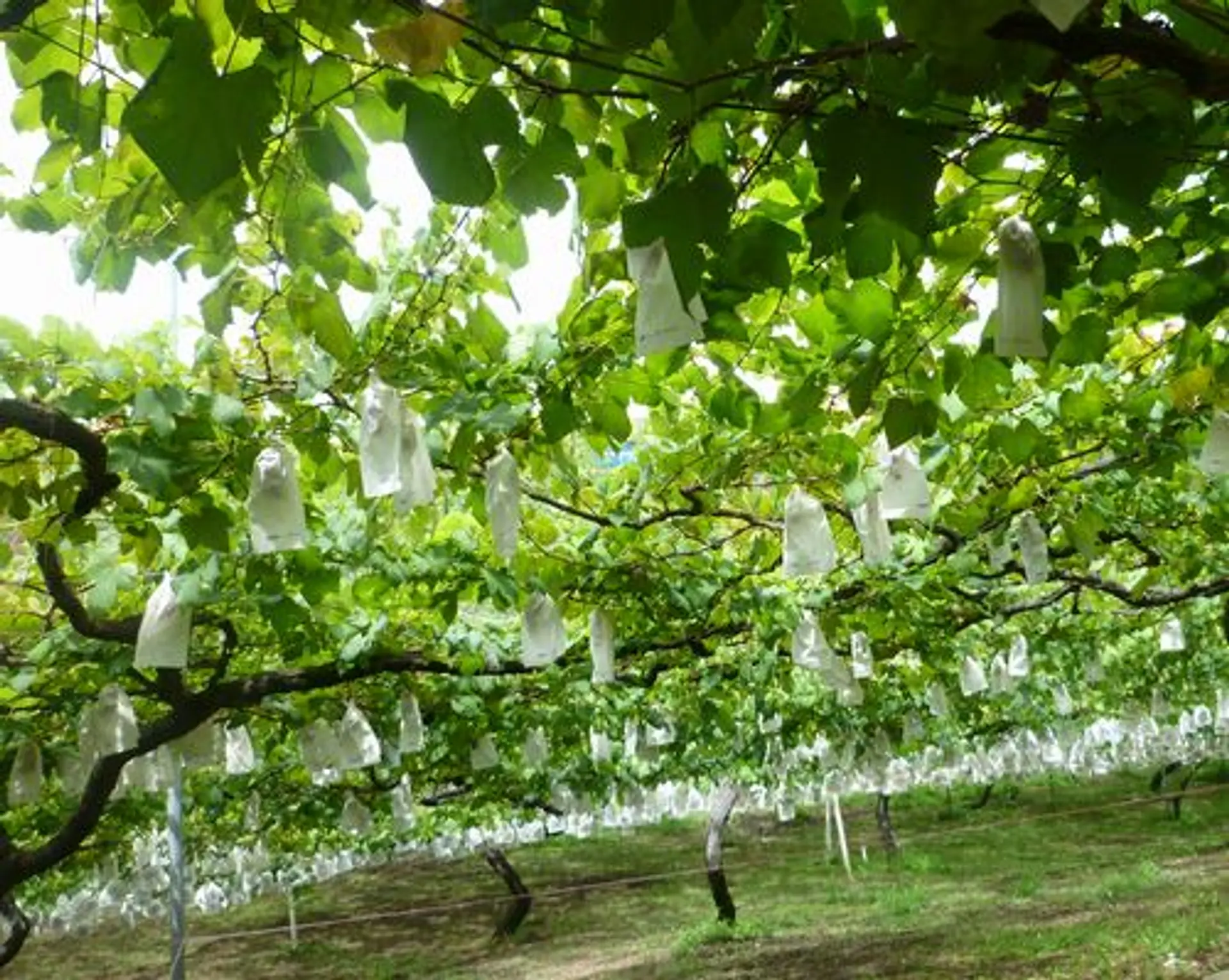 紹介されたぶどう園に行くと、一面に色鮮やかなグリーンの幕を張ったかのようなぶどう棚が広がり、とっても清々しい気分になります。そして、小粒で甘~いデラウェアがたくさん実っていました。