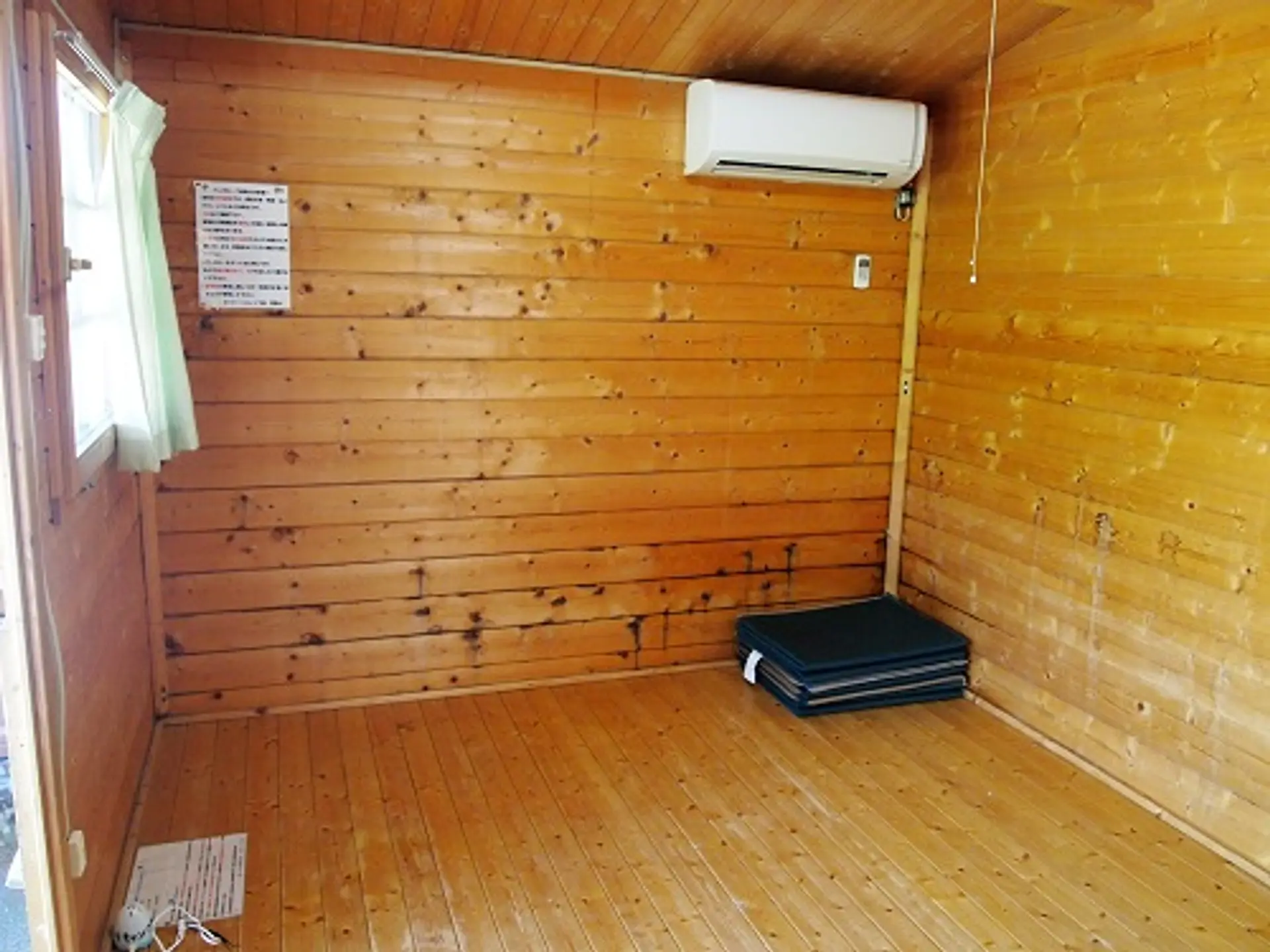 バンガローの部屋は6畳の広さ。照明、電源、テーブル・イスセット、エアコン、キャンプ用マットを完備。