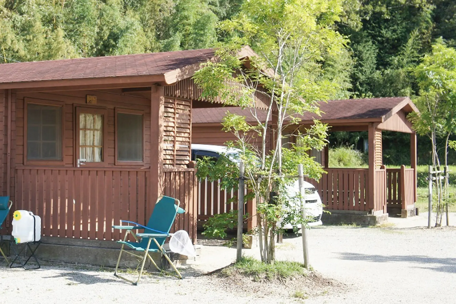 8棟あるバンガローの定員は5名。地面との段差がないので屋根付きテラス部分でバーベキューを楽しむこともできます。テントサイトに隣接しているので、オートキャンプと併用するグループも多いのだとか。