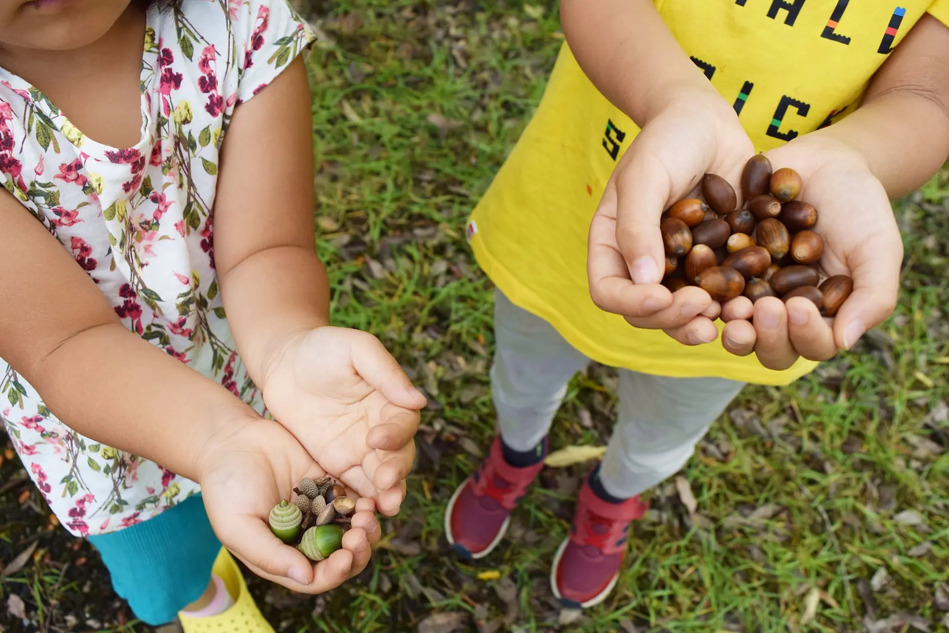 どんぐりを拾ったり、四つ葉のクローバーを探したり…。広い敷地の中は、子どもたちにとっては絶好の遊び場です!
