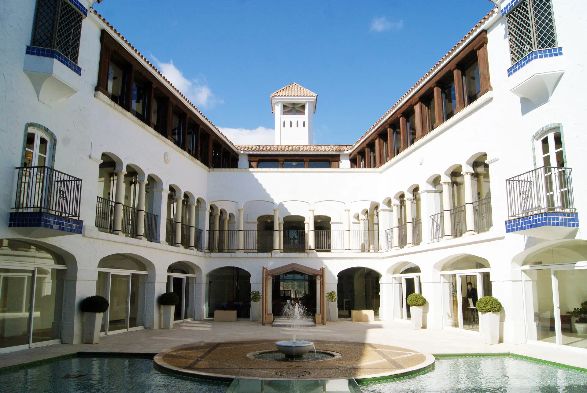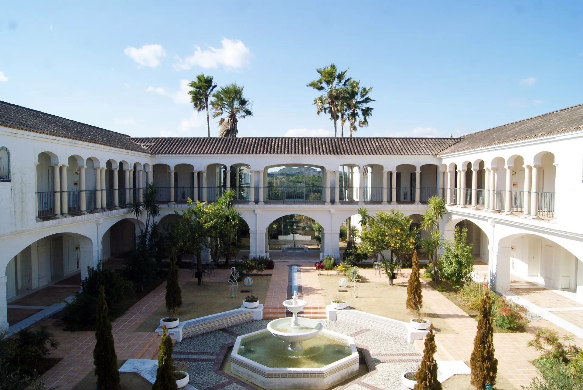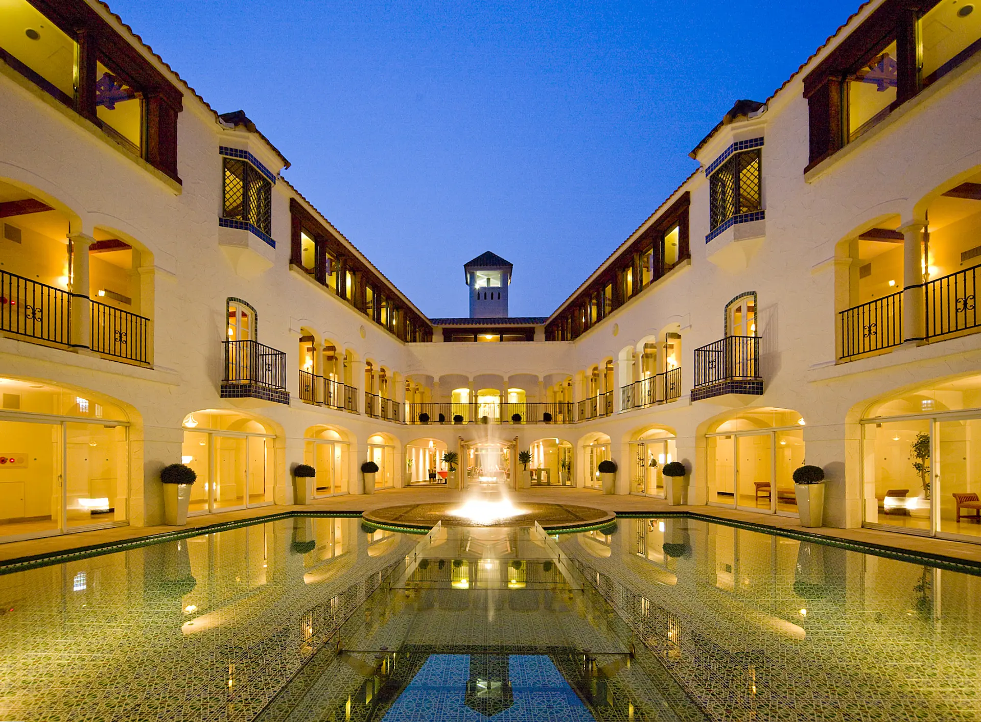 こちらのパティオもまた素敵! スペインのアルハンブラ宮殿様式を取り入れた空間で、大きく成長したヤシの木がシンボルとなっています。