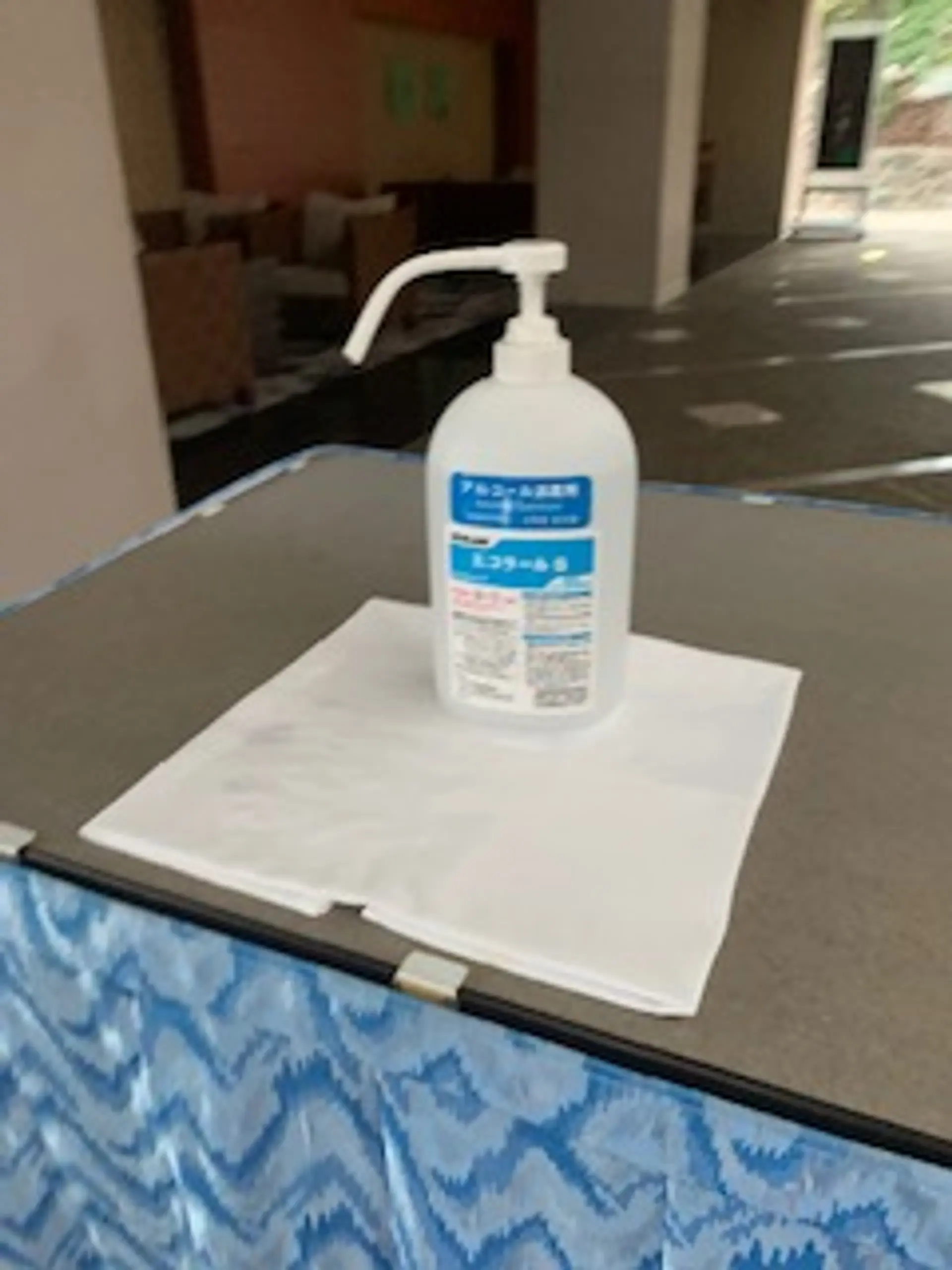 ホテル施設内は各所に、自動検温器、消毒液を導入している。