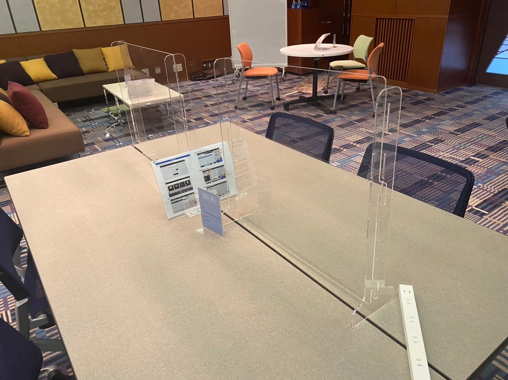 ワーケーションコテージやコワーキングスペースでは、施設内全体の抗菌加工に加え、飛沫防止策として、アクリル板を設置しており、利用者が安心して仕事に集中できる環境が整っている。