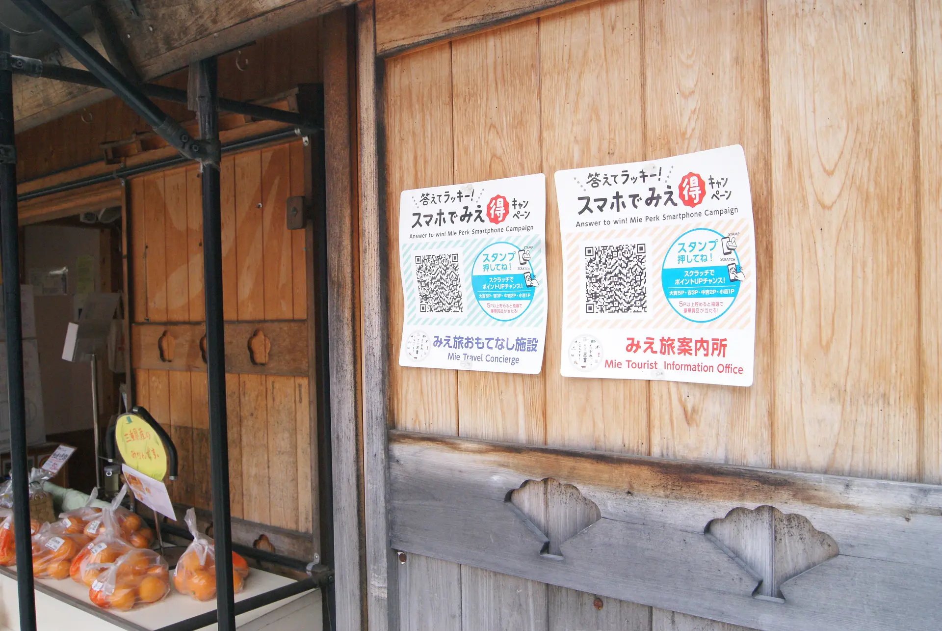 お土産品・物産販売コーナー入り口横に設置されている「 スマホでみえ得キャンペーン」のQRコードを読み込んでログイン。スタンプを押してスクラッチ。なんと! 大吉で5ポイントをゲットです!「花の窟」の御利益があったのかも。 そして、アンケートに回答し、会計時にスタッフの方に見せると、いざなみ米入りみたらし団子をもらっちゃいました。