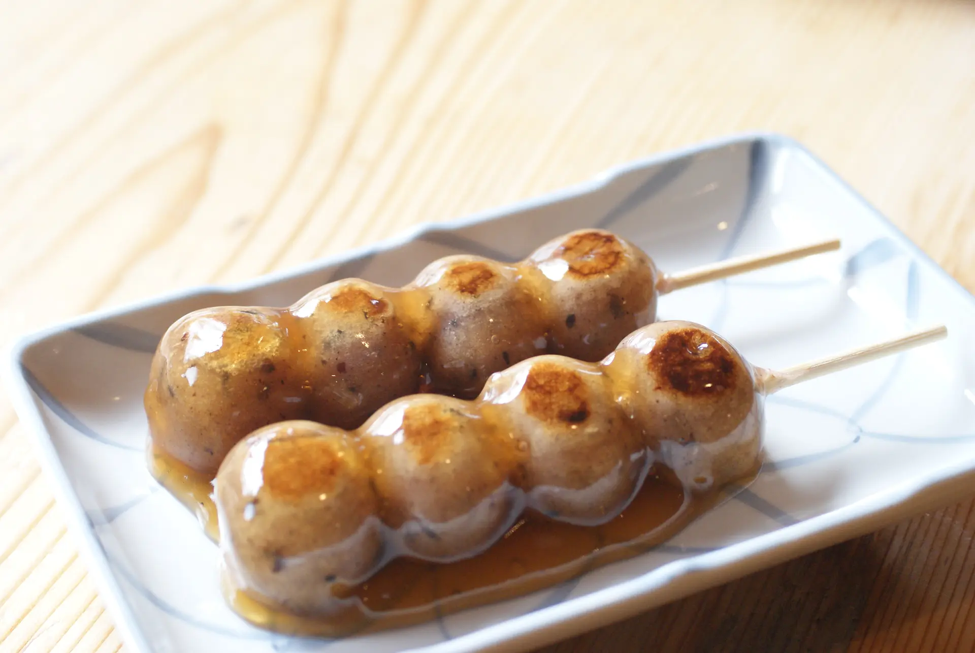 甘味では、「いざなみ米 みたらし団子」が不動の人気です。黒米の「いざなみ米」を使うことで、紫がかった独特の色合いの団子。これにこんがり焼き目をつけて、甘辛いたれをたっぷりからめた熱々をどうぞ!