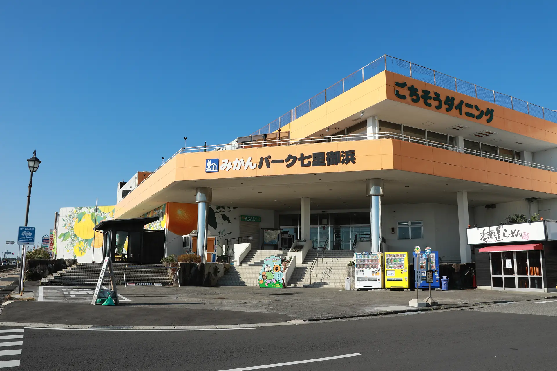 七里御浜沿いに、車で15分ほどさらに南下すると、青空にくっきり映えたみかん色の建物が現れます。「道の駅 パーク七里御浜」です。