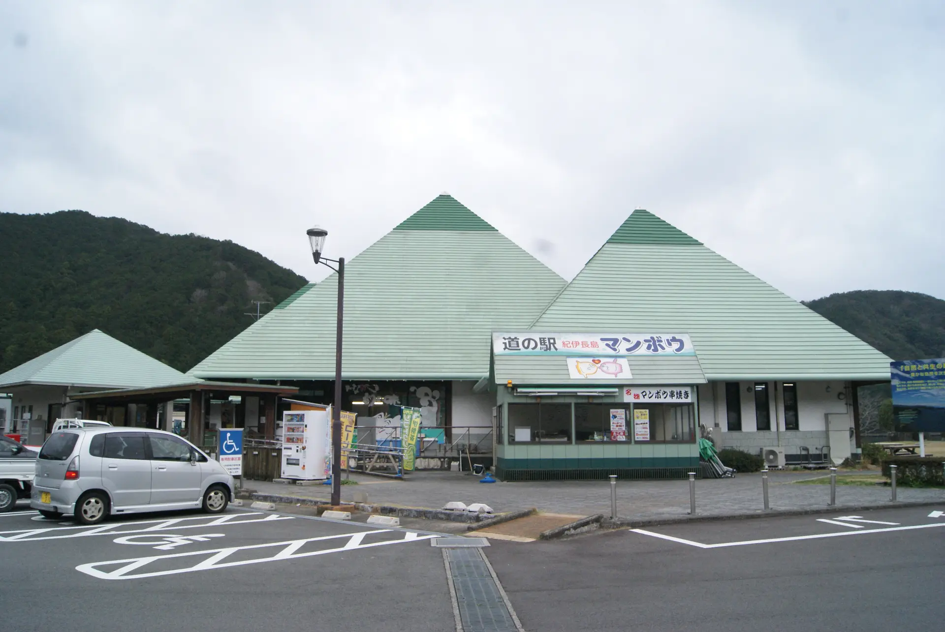 国道42号を南下し、紀北町に入ってすぐの所に見えてくる緑色の大きな三角屋根、東紀州地域最初の「道の駅 紀伊長島マンボウ」です。この色と形は、地域特産の尾鷲ヒノキをイメージしたんだとか。