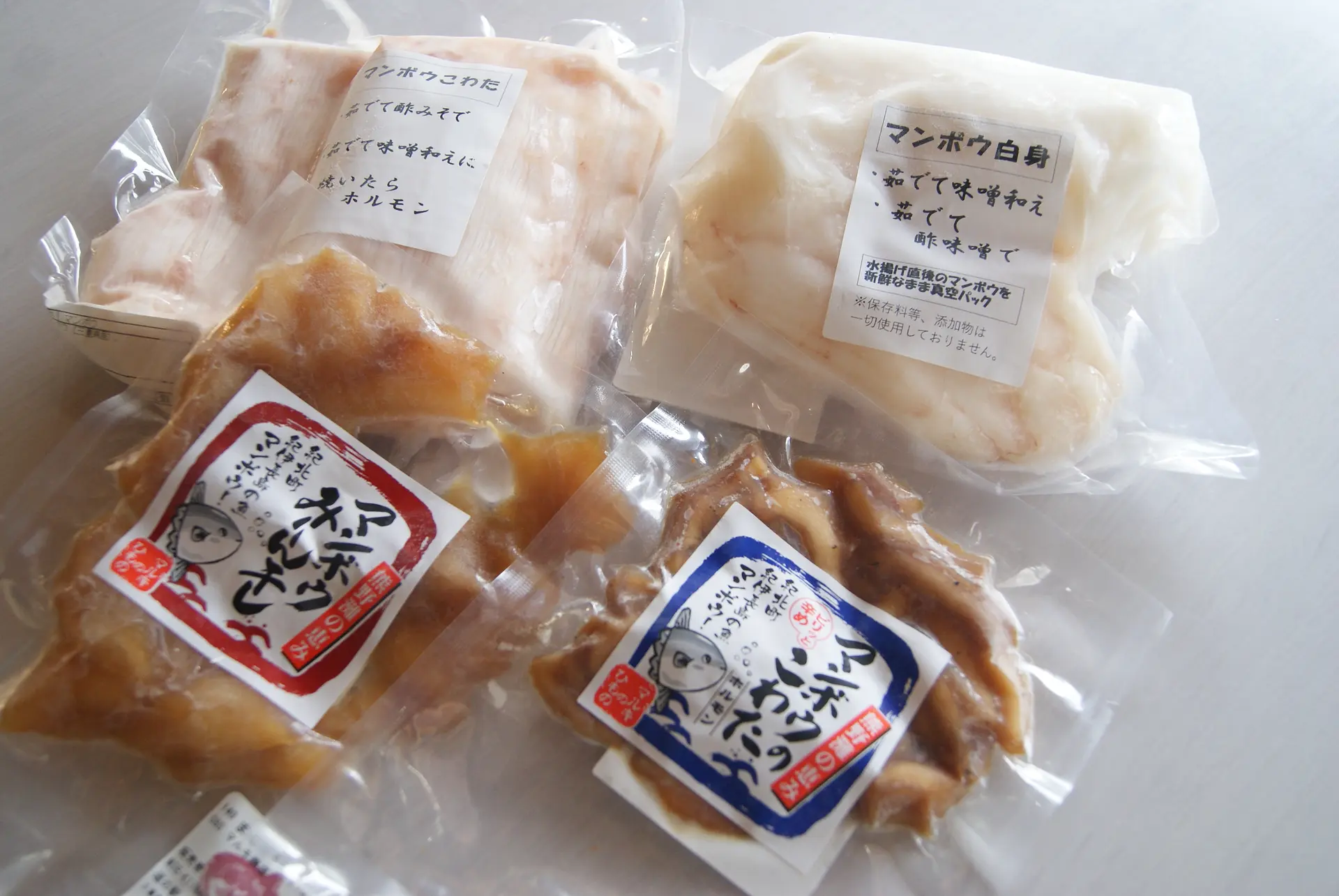 冷凍ケースを覗きながら歩いていたら、見つけました、マンボウ! きれいな白身とこわた。「こわた」とはマンボウの内臓のことだそうです。マンボウのお味など、再び、東さんに伺いました。