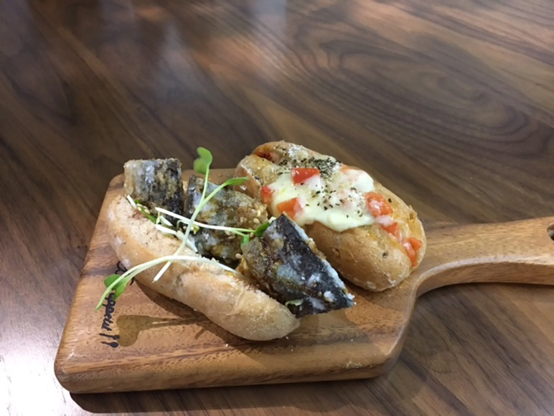 物産コーナーと同じフロアにはカフェスペースもあります。メニューには、地元の産品、新鮮な海産物を使ったお食事メニューが並びます。それと、8種類の具材から2品を選んで注文するミニドッグにも注目。