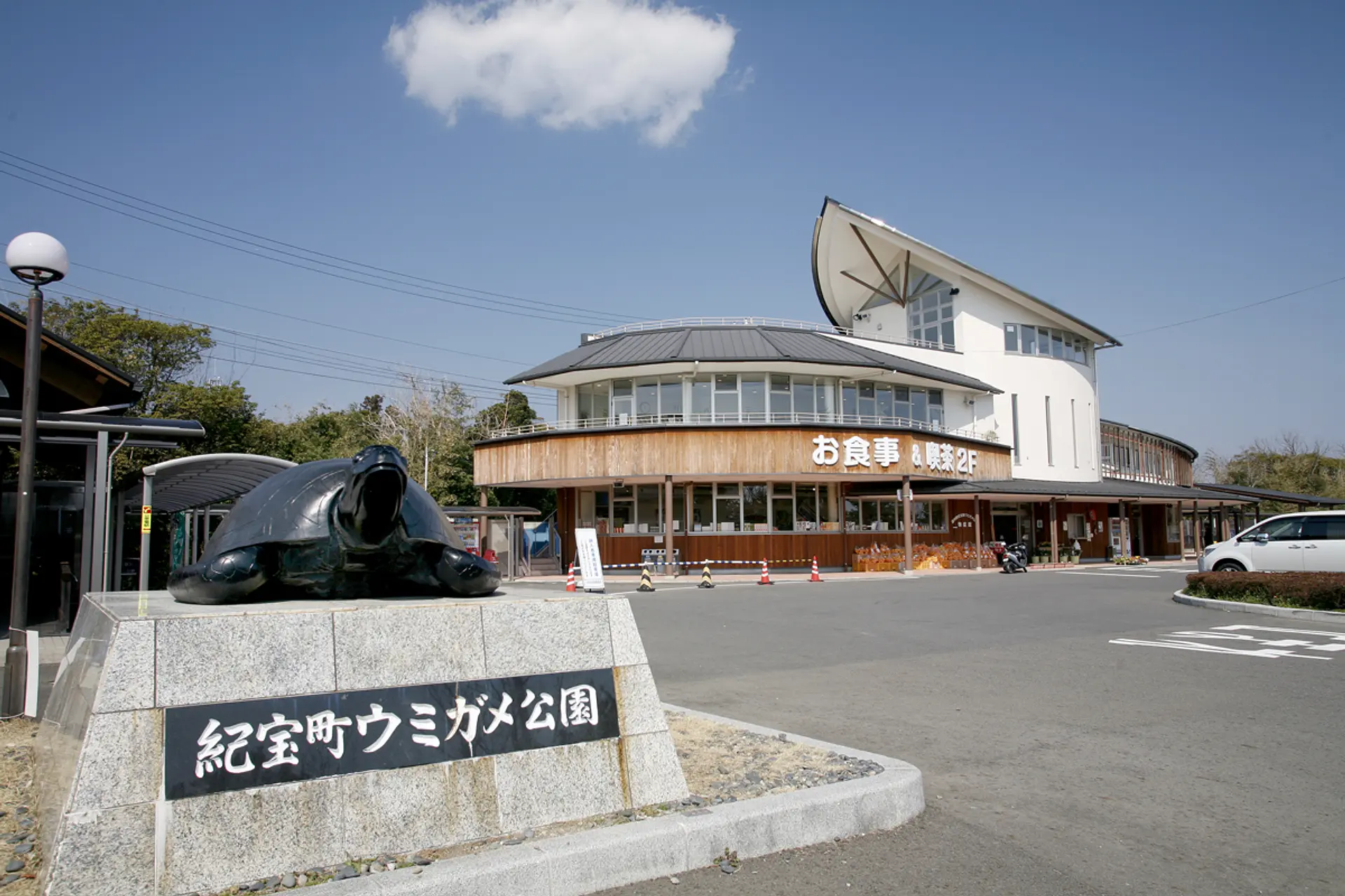 七里御浜沿いに、車でさらに10分ほど南下すると、黒いウミガメの石像がお出迎えしてくれます。全国で唯一の、ウミガメを観察できる道の駅です。