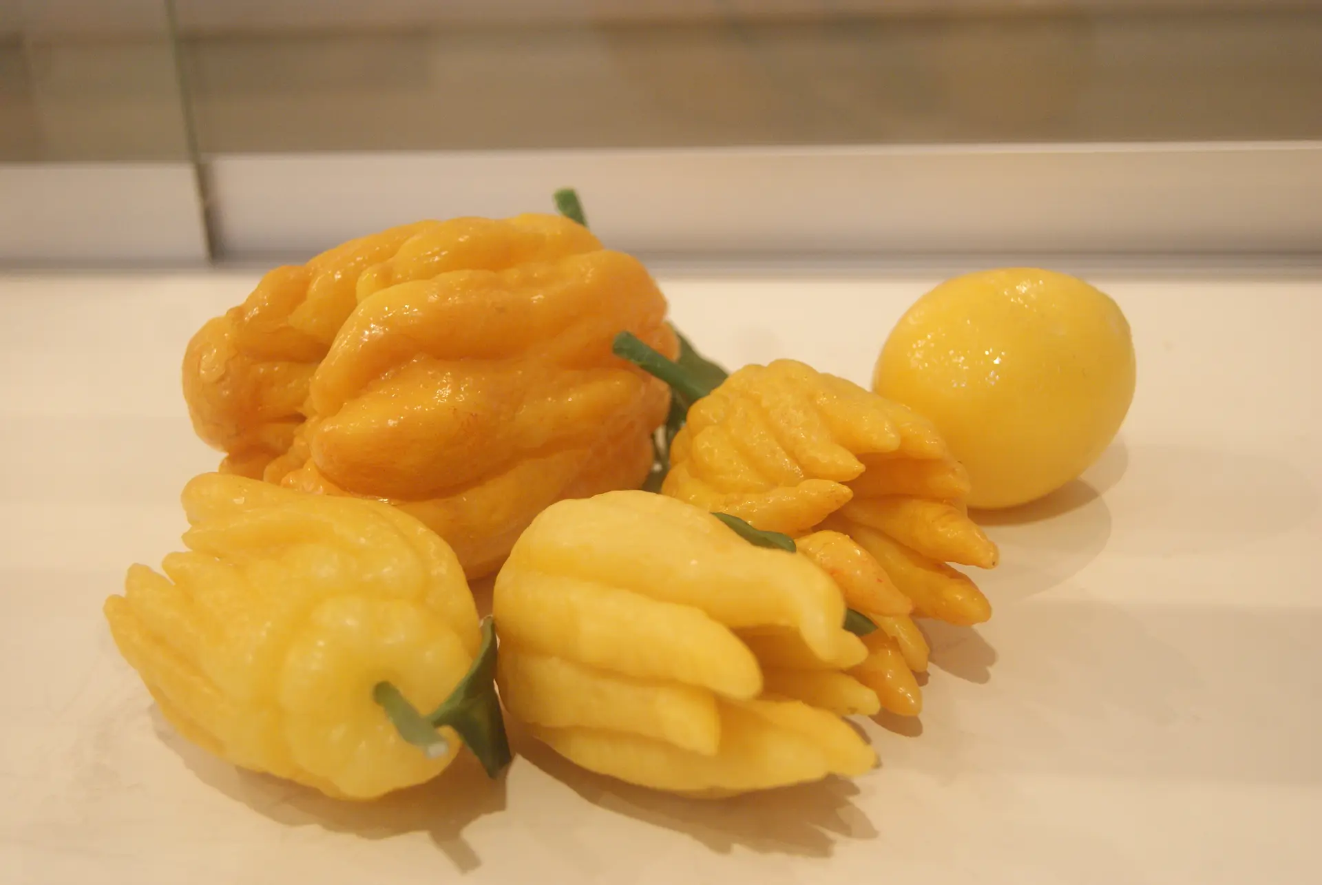 工場の前のガラスケースには、さまざまな種類のみかんが展示されています。食用だけでなく観賞用のみかんもあり、中には「仏手柑(ぶっしゅかん)」という不思議な品種も。残念ながら模型ではありますが、これまた、ここでしか見られない超レアなみかんでは?