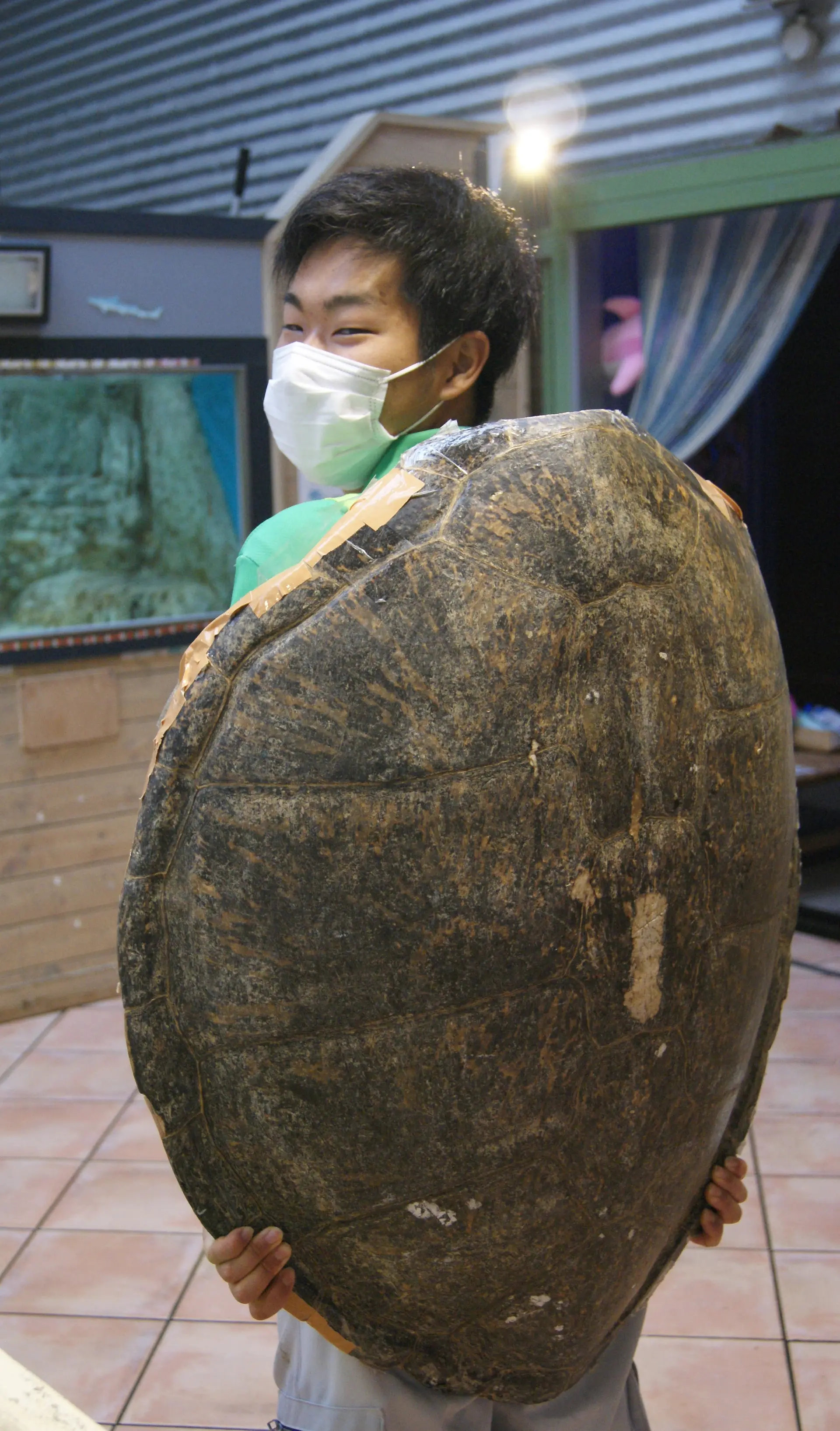 ウミガメの甲羅を背負う、こんな体験もできるんです。この甲羅でなんと重さ7kgほど。