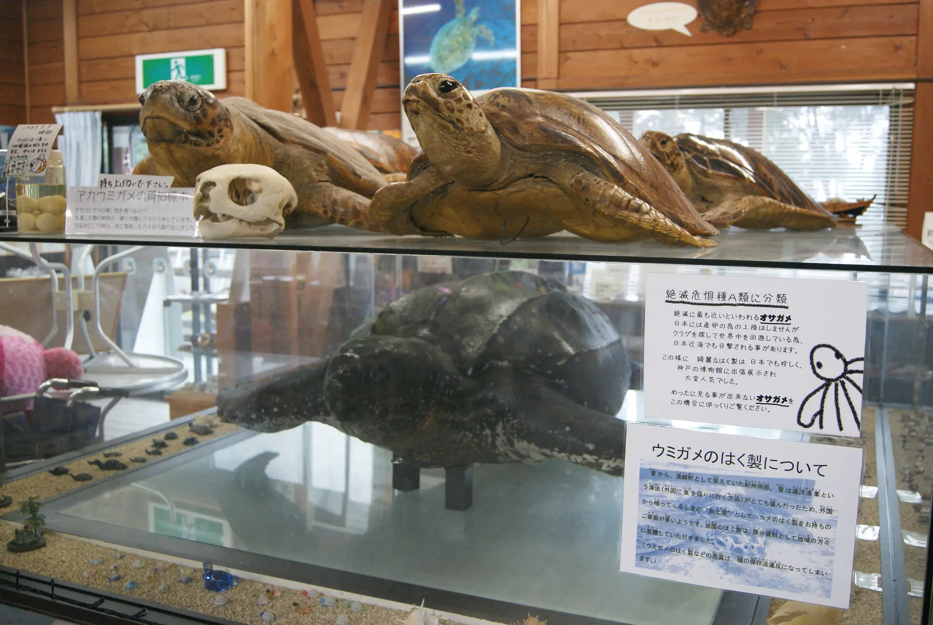 プールの前室、ウミガメ資料館にあるのは、何体かのウミガメのはく製です。ガラスケースの中にいるのは、ウミガメの中でも最大のオサガメのはく製。紀宝町の前の熊野灘で命を落としたウミガメだそうです。ガラスケースの上のアカウミガメも小さい方ではないのですが、大きさの違いは一目瞭然。その大きさから、専門の研究者が見学に訪れるほどなんだとか。