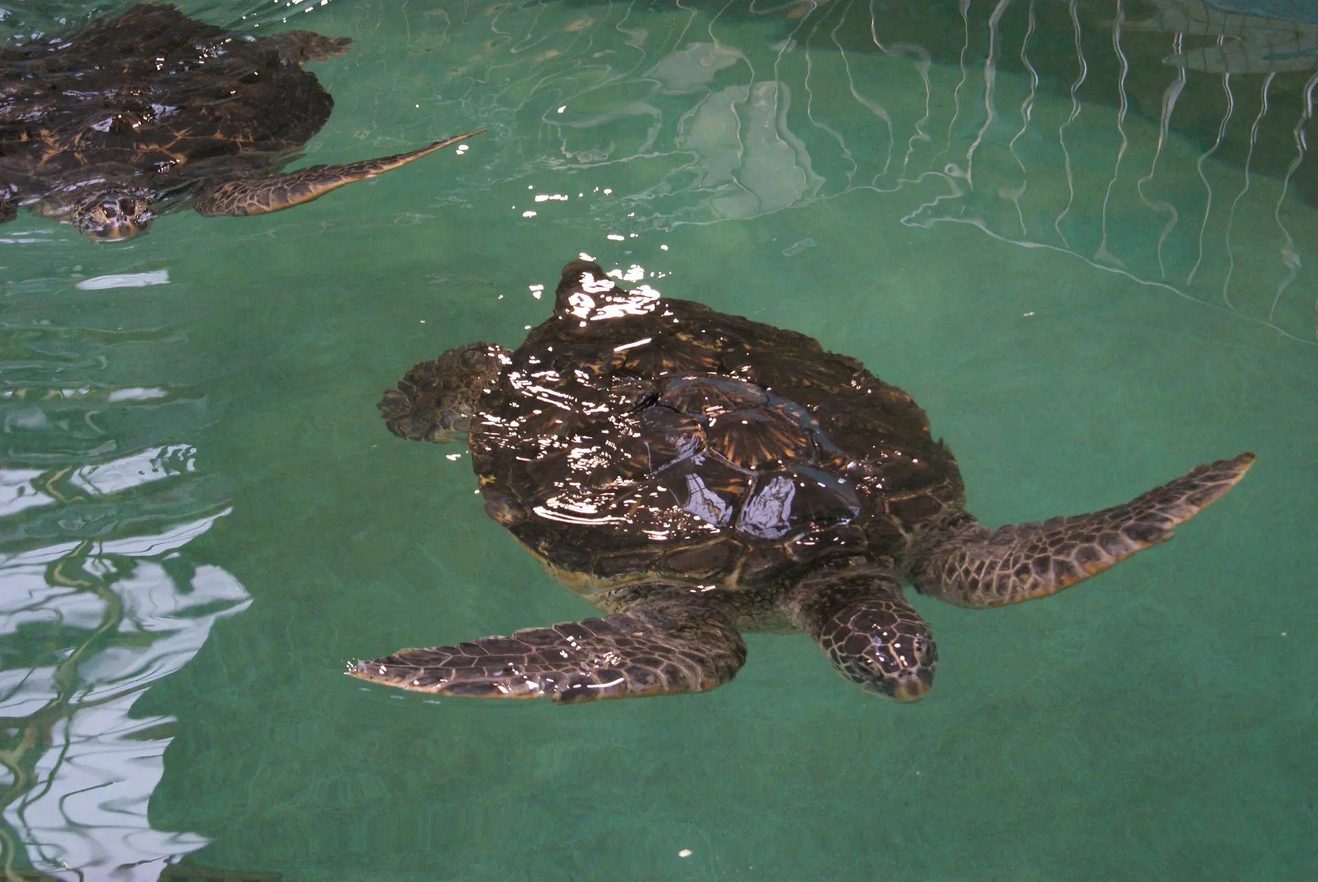 巨大プールですいすい泳ぐ姿を、上からも横からも観察できます。おや?人影が見えるとウミガメたちが寄ってきました。どうやら、エサがもらえると期待しているみたい。エサの与え過ぎにならないよう、数量限定でエサやり体験も実施しているんです。