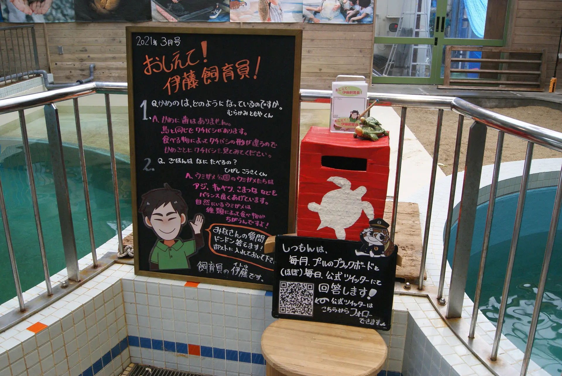 プールの前にはこんなブラックボードが。飼育員の伊藤柊也さんが、来場者の素朴な疑問・質問に答えています。回答はこのボードとツイッターとでこまめに公開。「大人より子どもたちの質問の方が難しいです。『カメってなんですか?』なんて、哲学じゃないですか?」と伊藤さん。私も、ぜひ聞いてみたいです!これからも、みんなの疑問に答えてあげて下さいね!