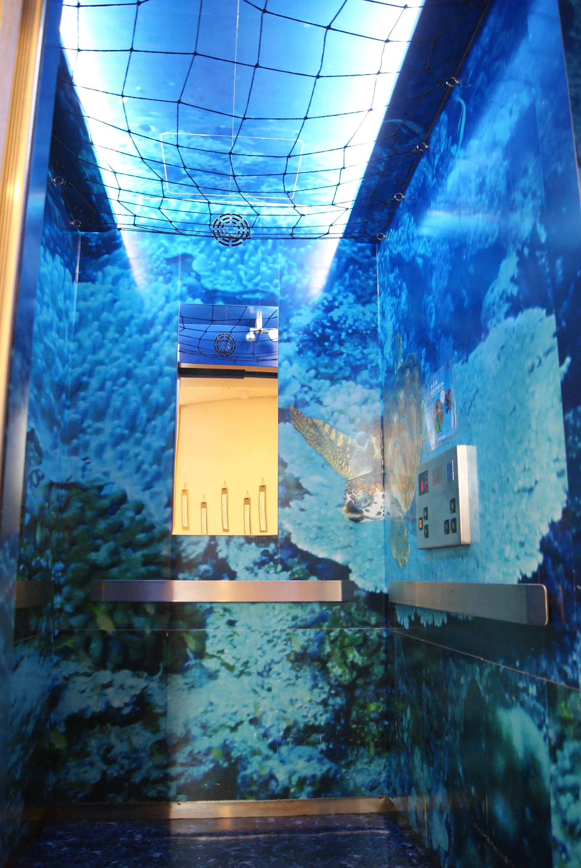 一瞬ドッキリしますが、よくよく見れば、海の中の光景が描かれています。エレベーターで上下すれば、悠々と泳ぐウミガメと一緒に、青い世界を漂う感覚に浸れそう。
